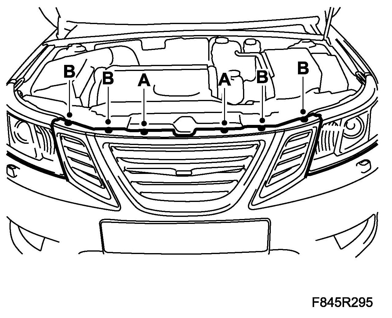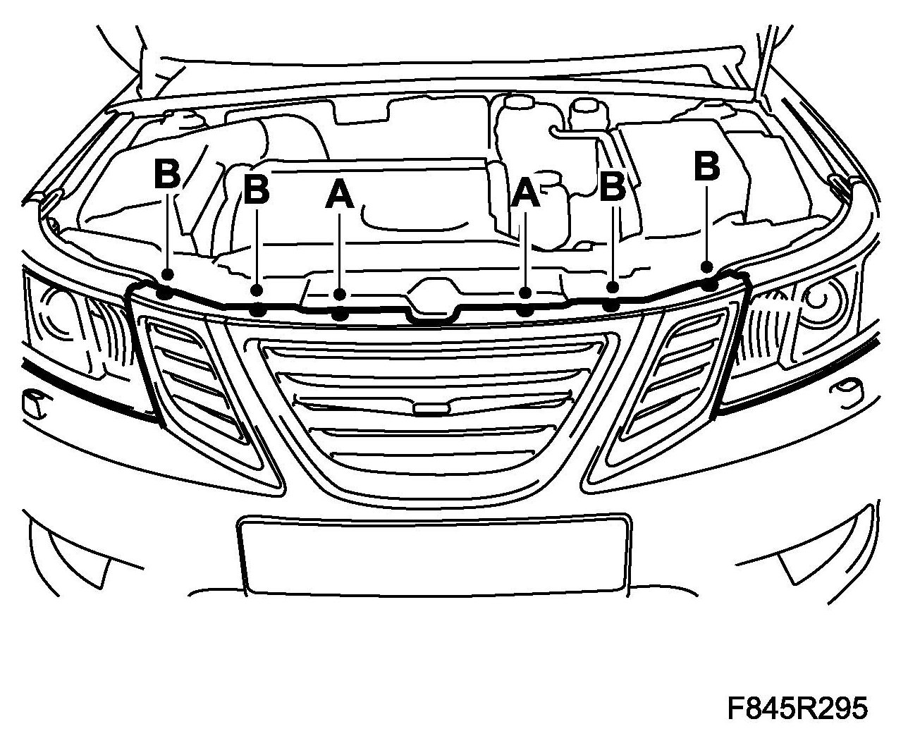 1. Remove the upper radiator member's clips (A) and bolts (B)