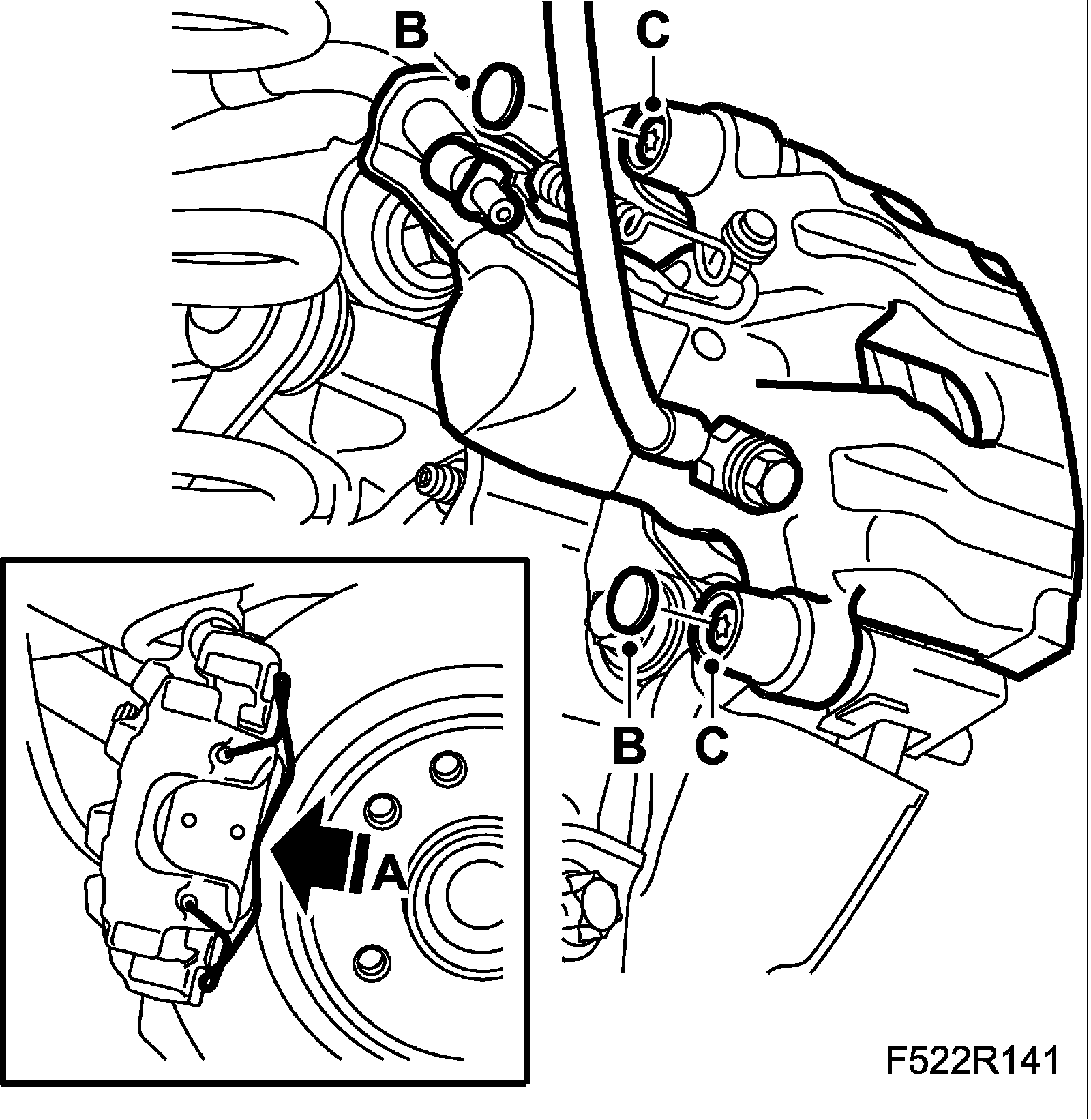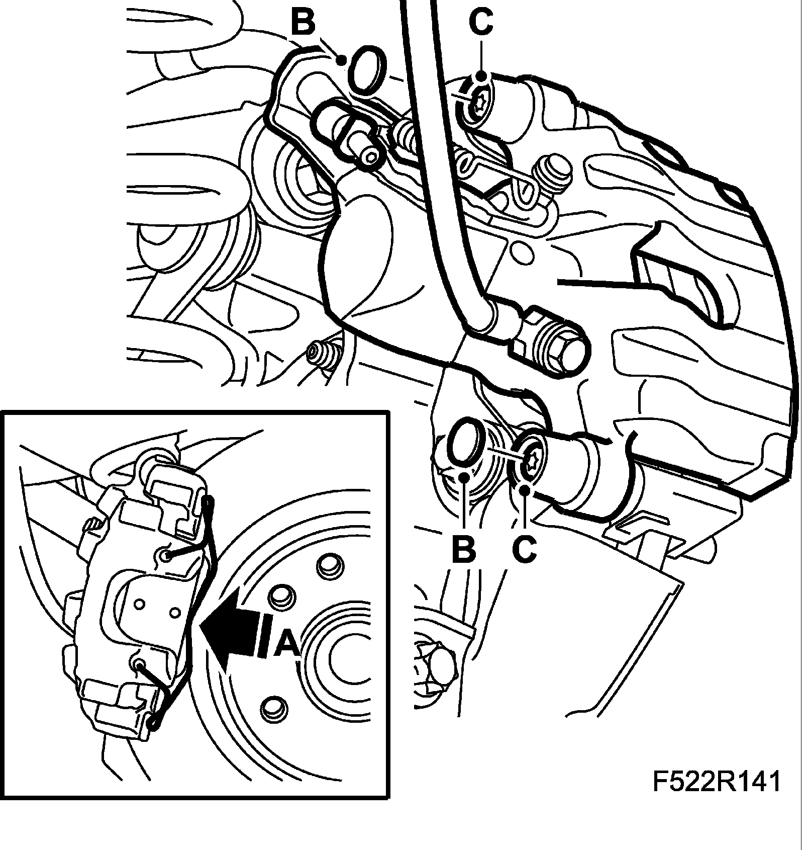 5. Fit the brake caliper with the guide pins (C) and the protective covers (B).