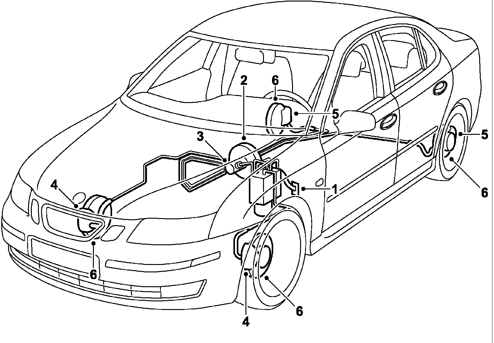The servo amplifies the outgoing pedal force and the increased pressure on the pistons in the master cylinder is conveyed simultaneously but divided into two hydraulic circuits to the front (4) and rear (5) wheel brakes. The brake calipers front and rear are self-adjusting, i.e. they continually compensate for wear in the brake pads.