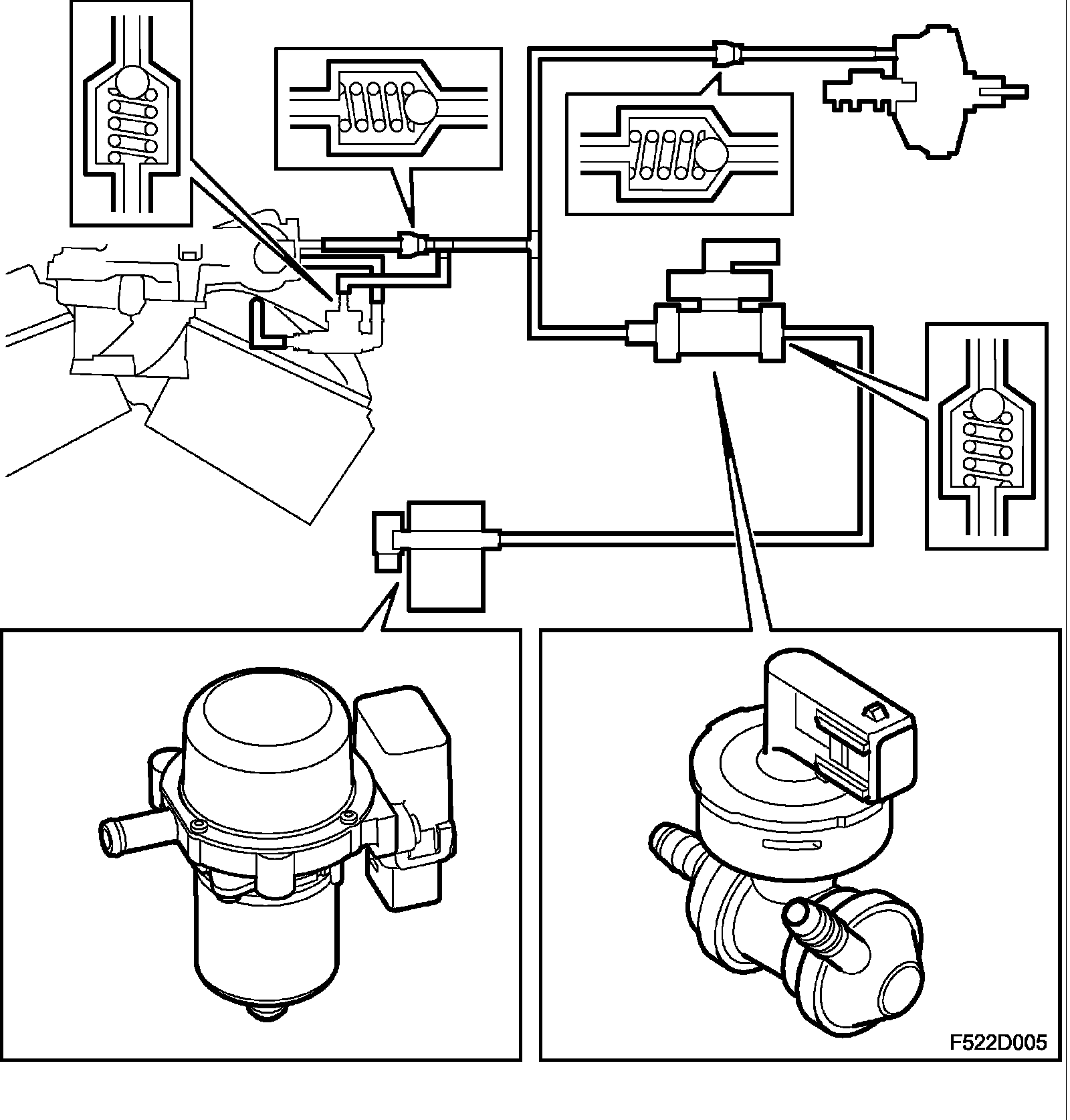 The electric pump is powered by +30 voltage via a relay. The relay in turn is governed by a pressure sensor located on the hose between the vacuum pump and the brake servo. This sensor comprises a diaphragm, spring, switch and check valve. The switch closes to start the pump at a pressure of 49 �3 KPa. When the pressure reaches 42 �3 Kpa, the switch will open and the pump stop.
