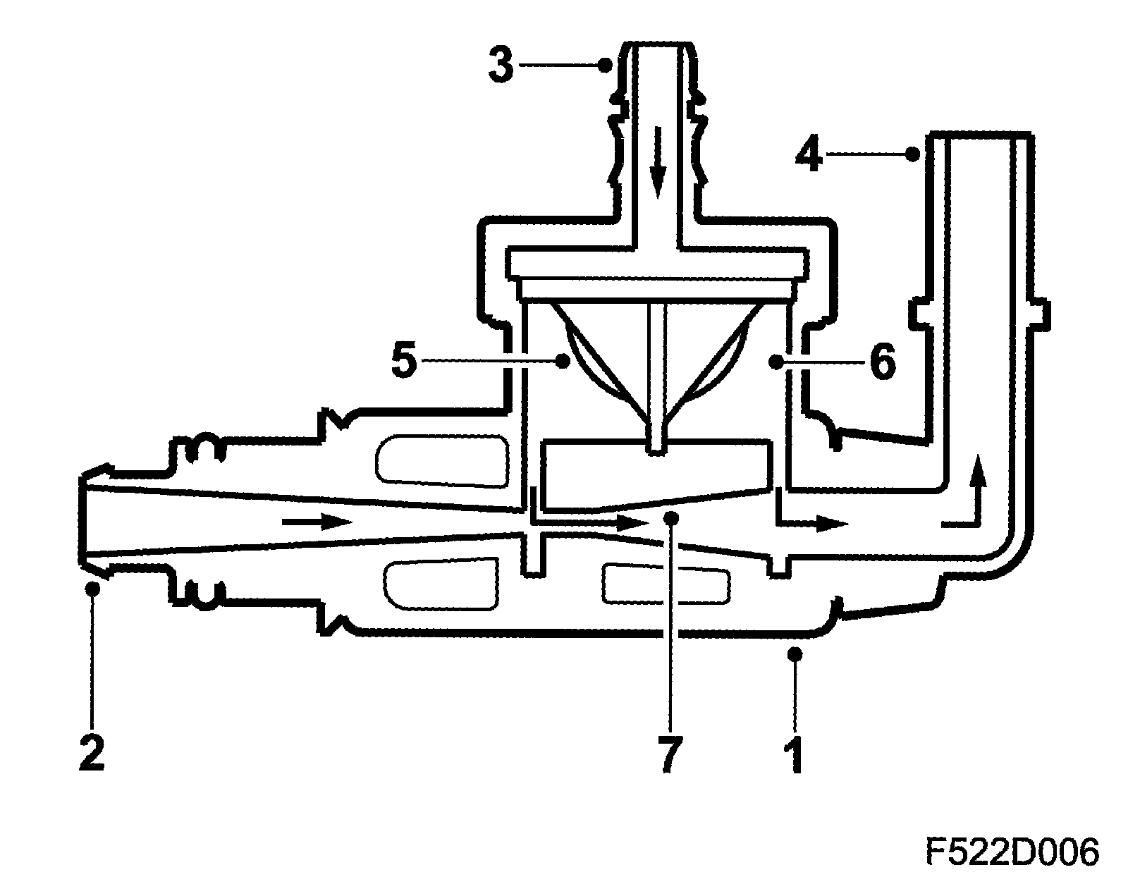 As the inlet in the jet is tapered, the speed of the passing air will be increased to create an ejector effect that increases the negative pressure in the hose connected to the brake servo (3). To prevent air flowing in the wrong direction through the chambers (6) to the brake servo, the venturi is equipped with check valves (5).