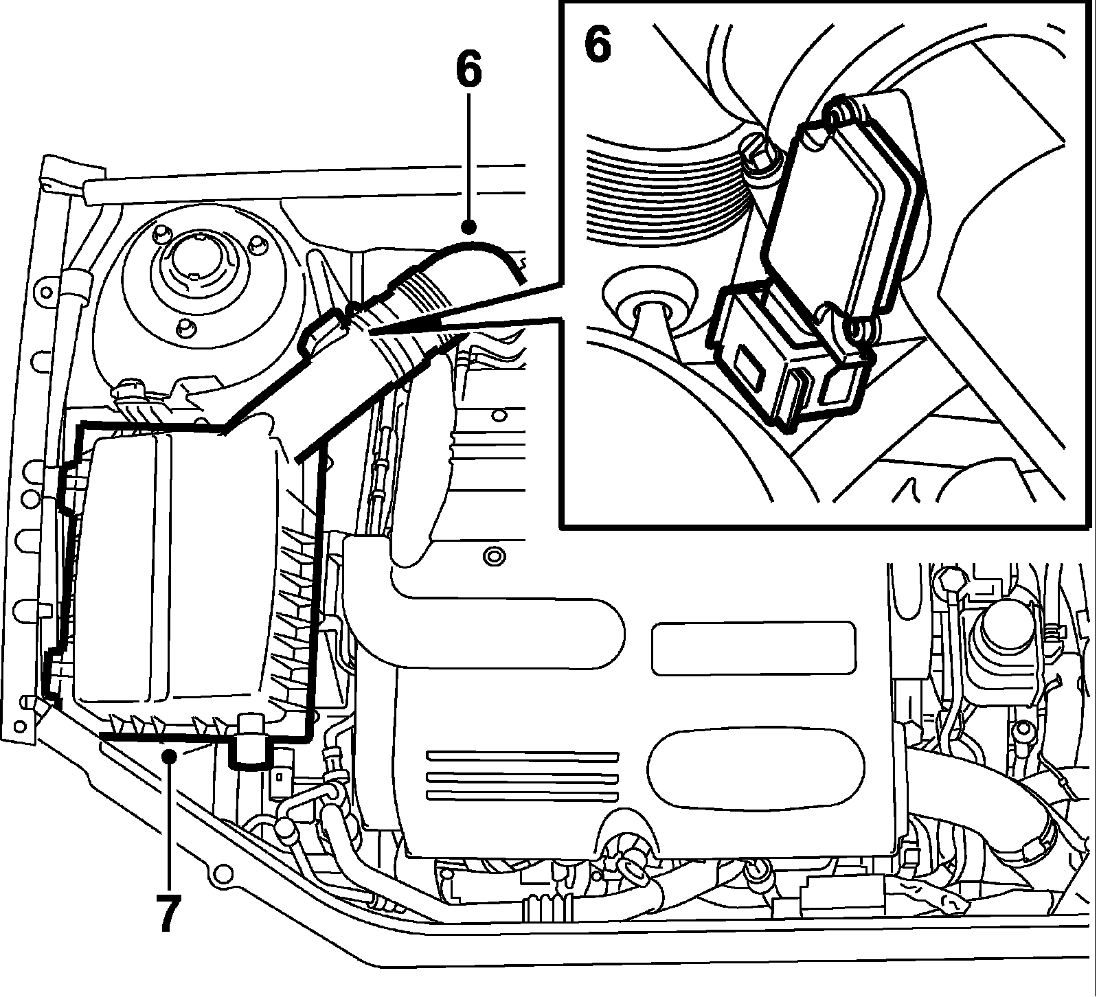 6. Remove the turbocharger intake hose, unplug the mass air flow sensor connector.