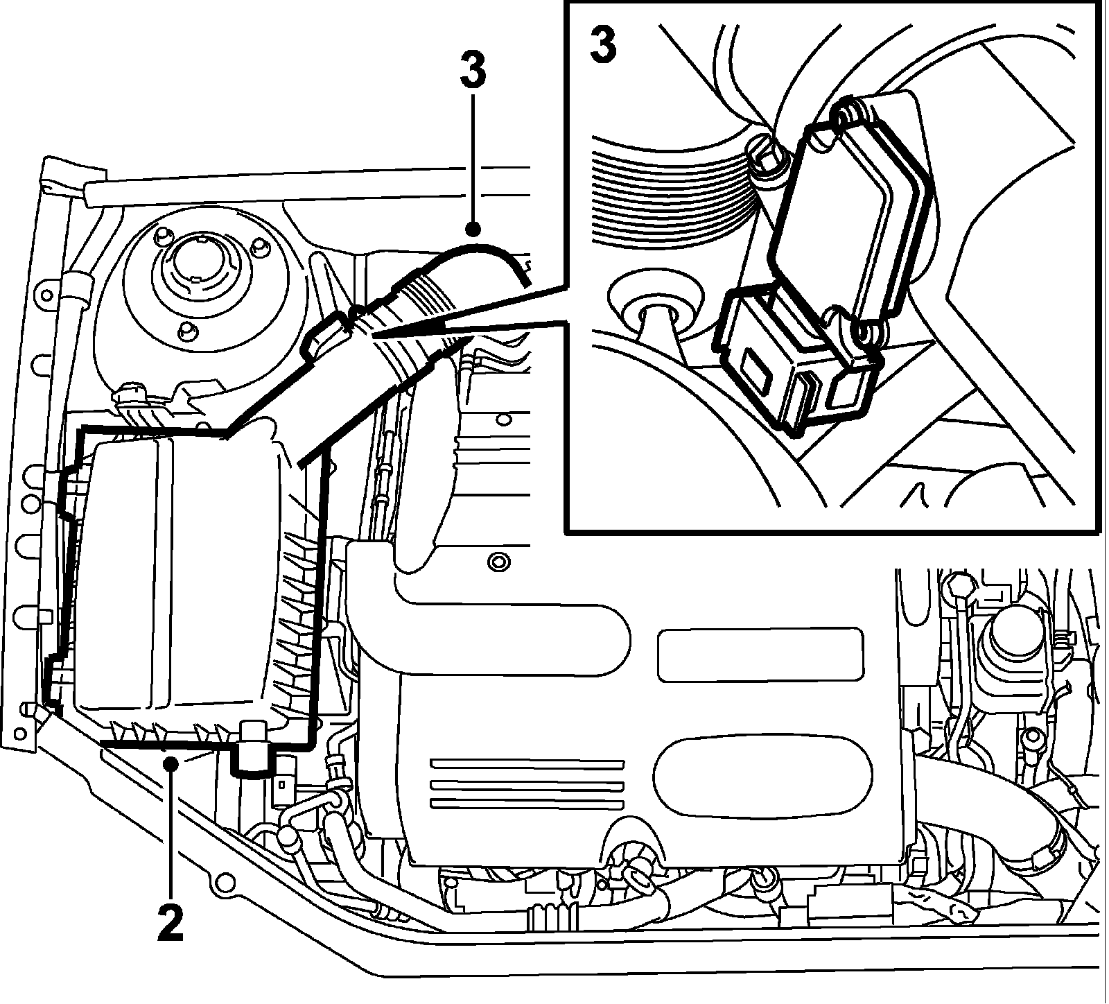 3. Plug in the mass air flow sensor connector and fit the turbocharger intake hose.