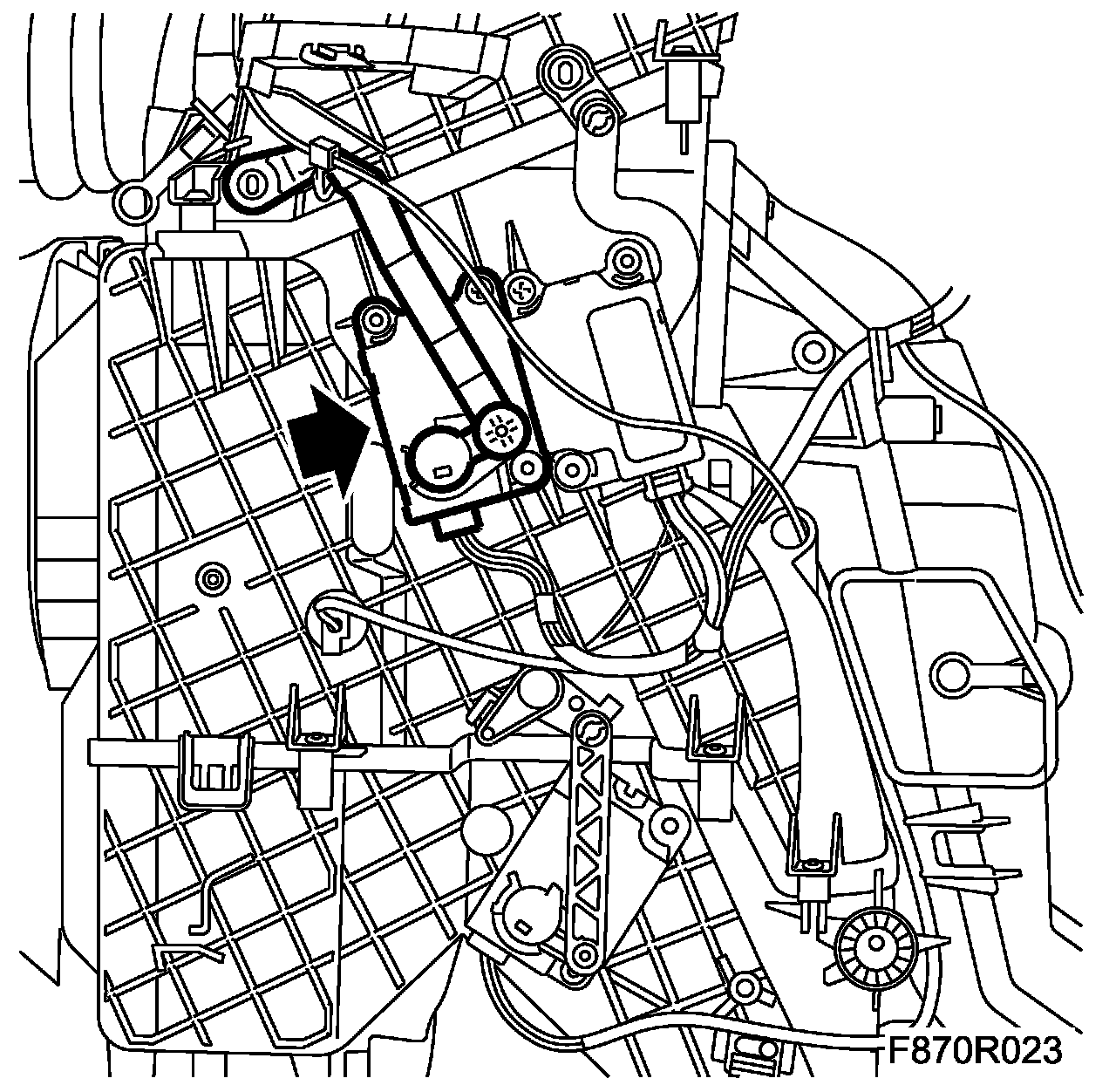 The defrost air distribution flap stepping motor is located at the top front on the heating and ventilation unit's left hand side.