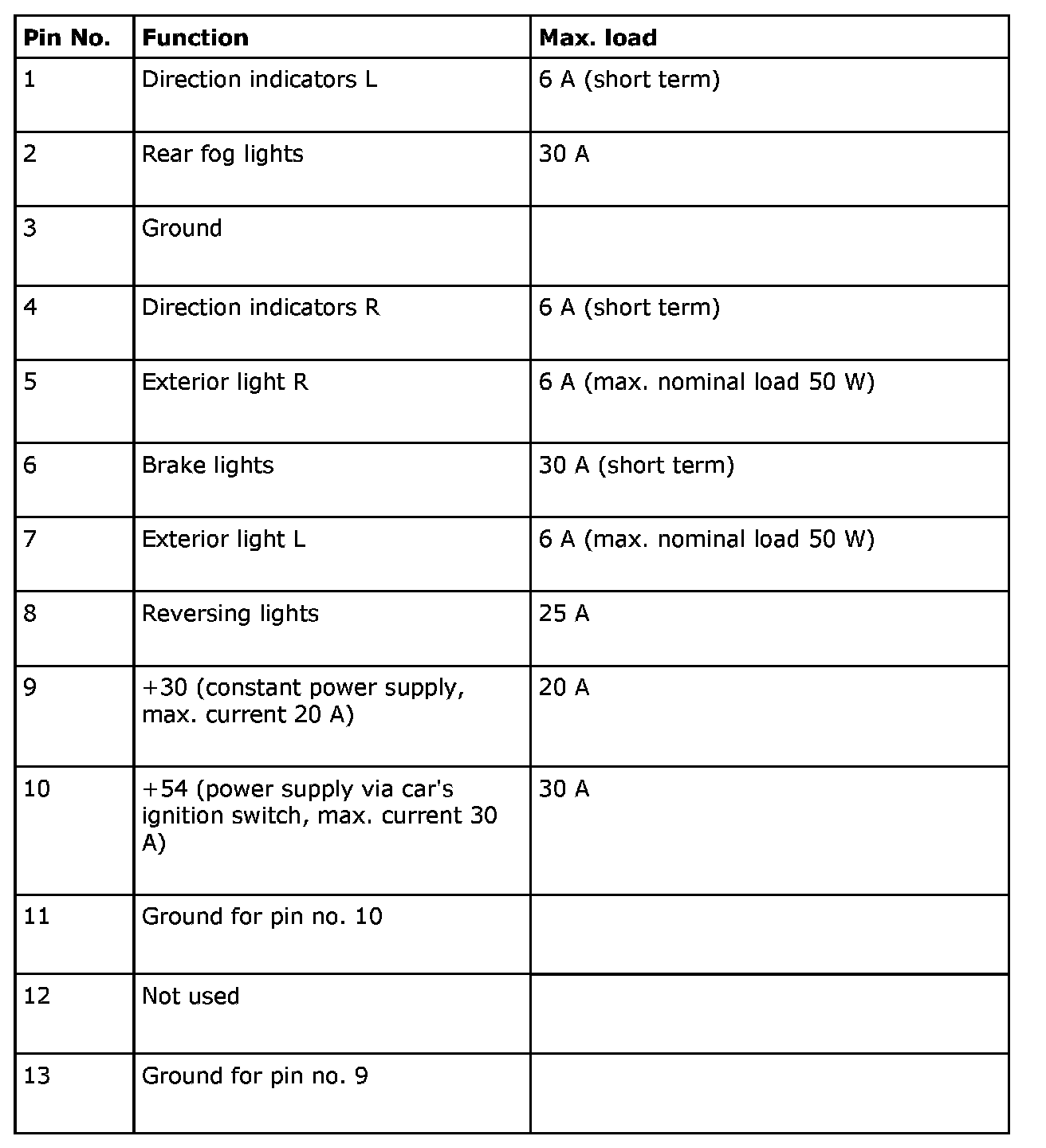 IMPORTANT: A rear fog lamp (if fitted) cannot be used on the trailer. If connected to pin 9, the car's battery could be drained if the trailer is connected to the car and the car is not driven.