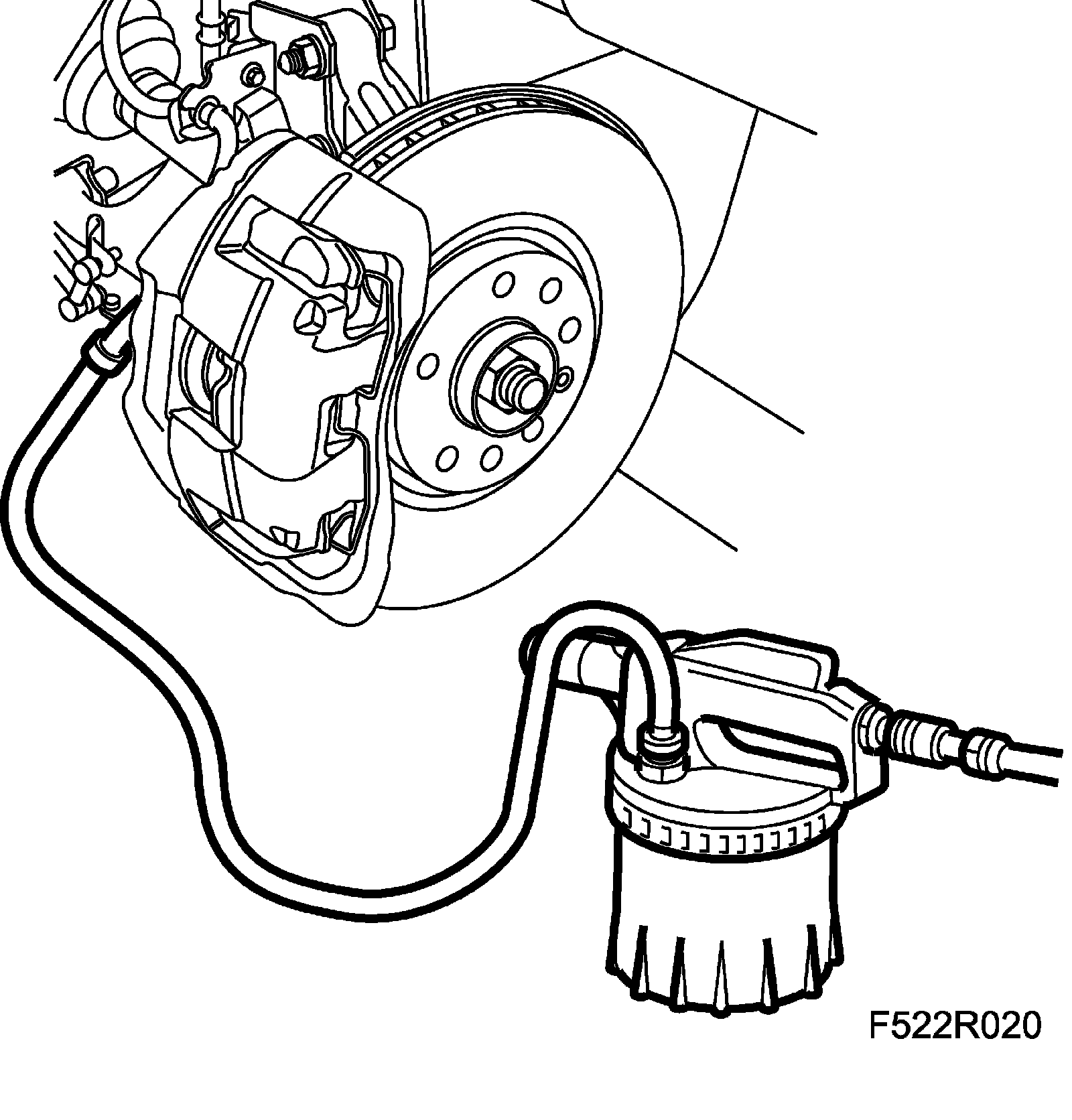 2. Raise the car. Connect the bleeder hose to the air nipple on the front left brake caliper and open the nipple. Drain about 100 ml brake fluid. Use 88 19 096 Bleeding equipment.