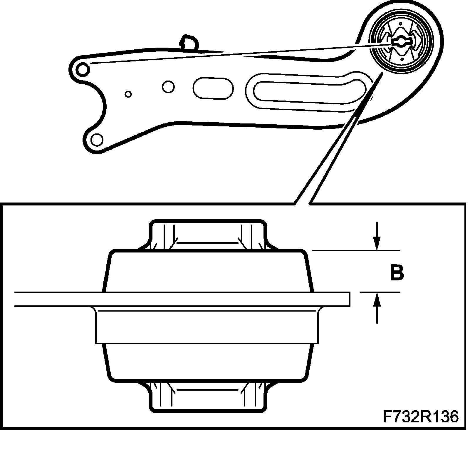 2. Use 83 90 122 Drift and 87 91 188 Support for removing pinion shaft to press in the bush. The bush should stick up 17 mm (B) above the flat side of the link arm.