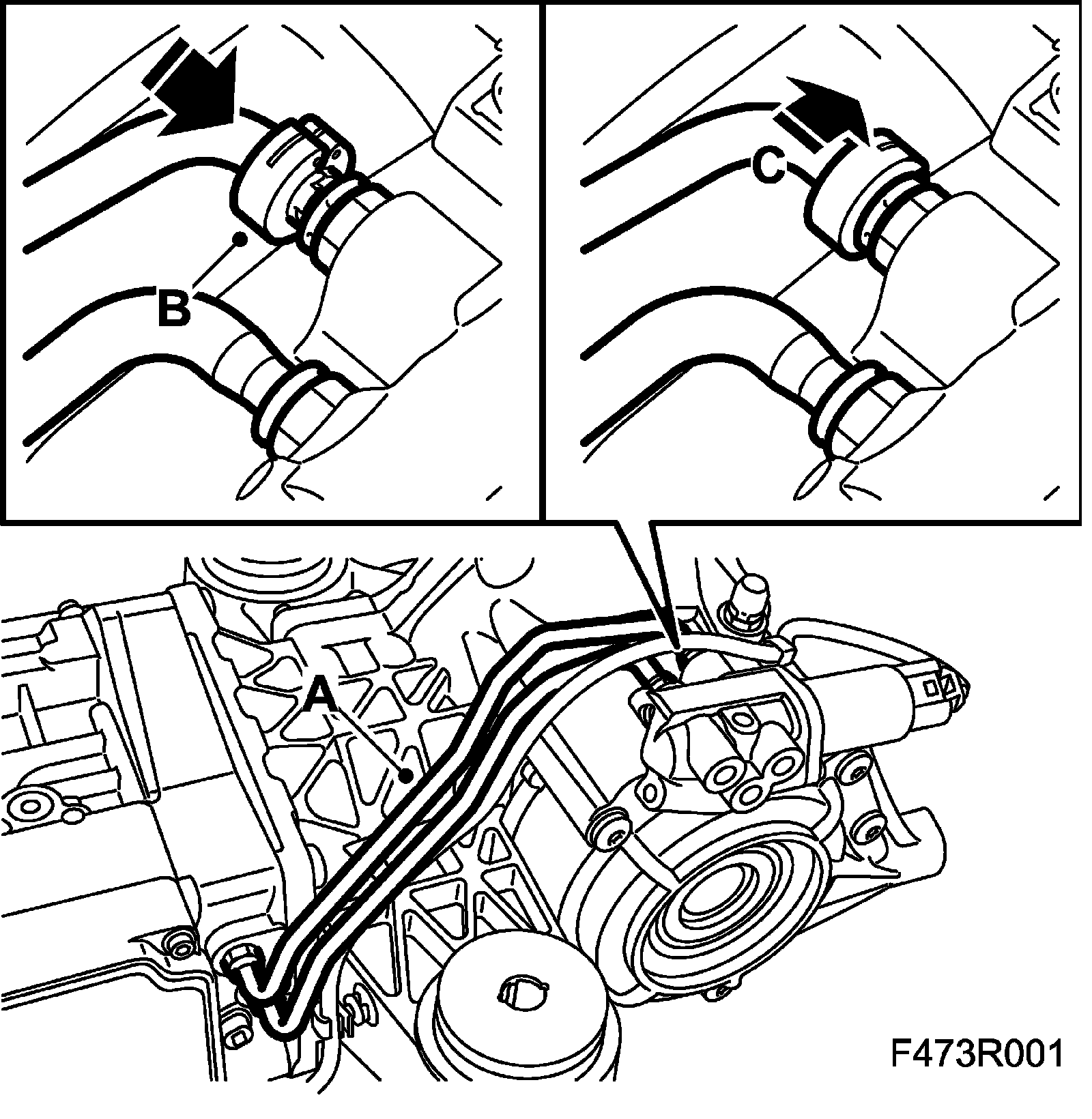 2. Remove the hydraulic pipes (A) fit tool DT-49132 (B). Turn the tool (C) slightly and pull the pipe out from the quick release coupling.