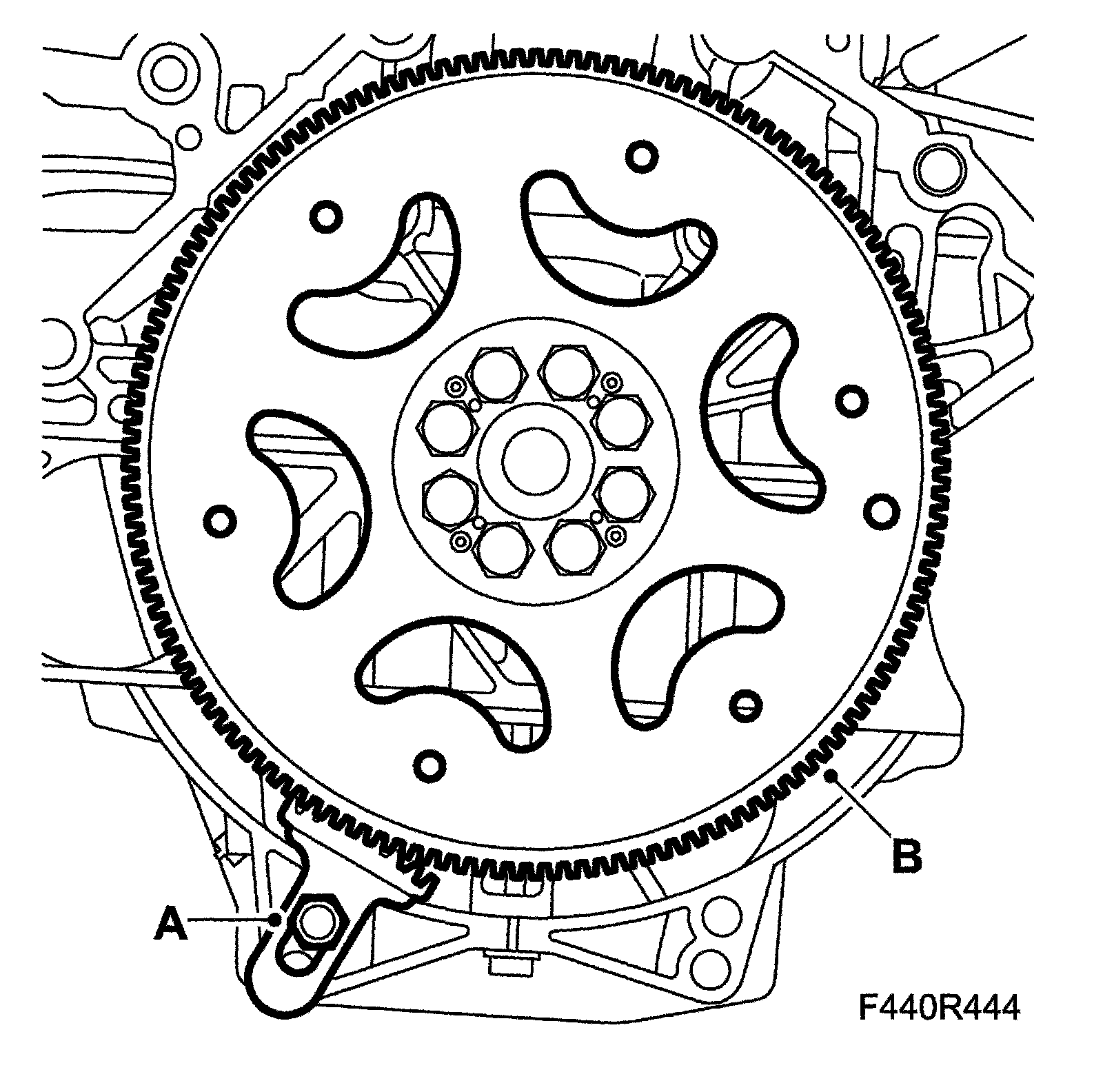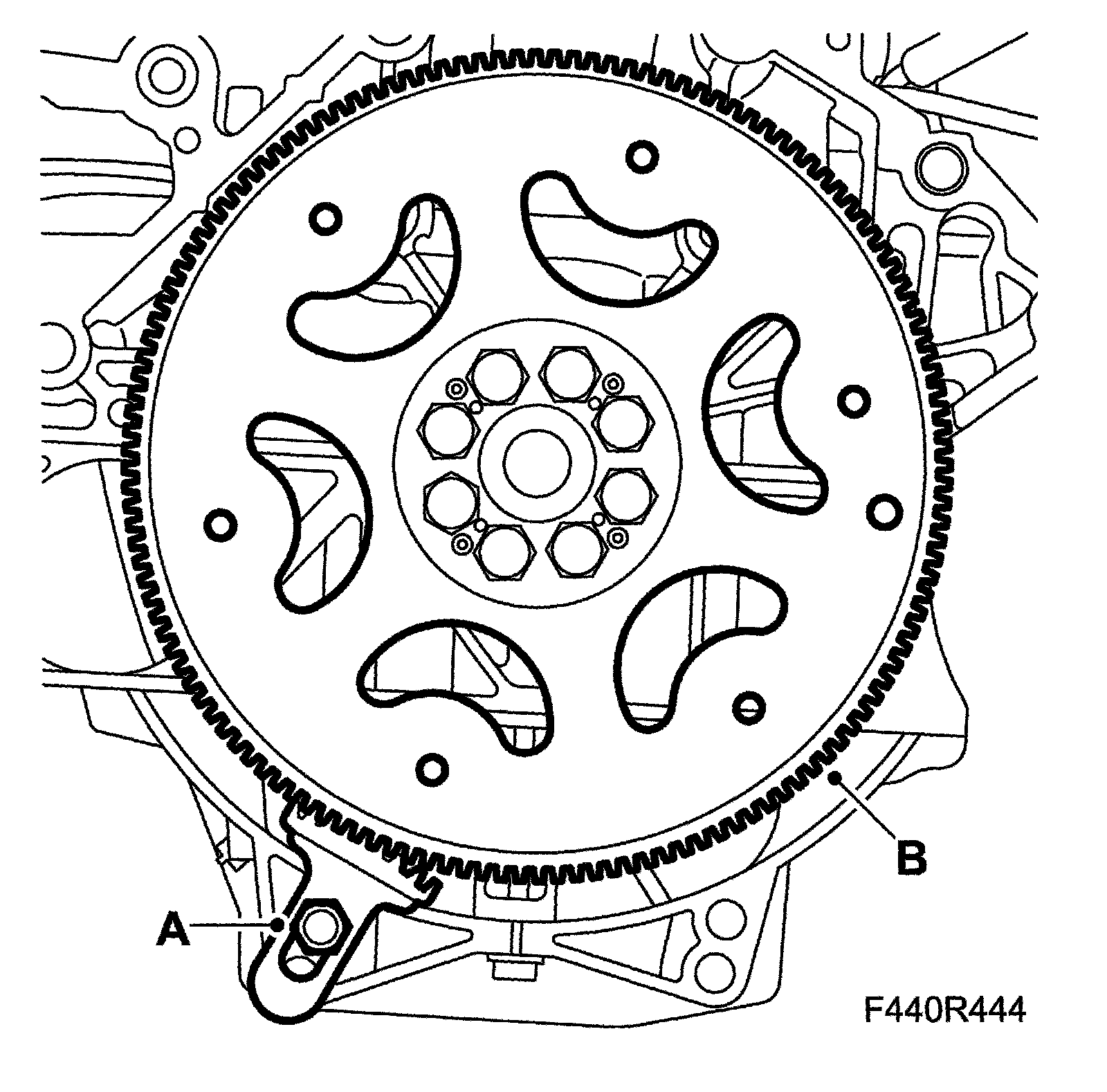 1. Fit the driver plate (B) using new bolts coated with thread locking adhesive Loctite 270. Fit 83 94 868 Flywheel locking attachment (A). Tighten the bolts alternately.
