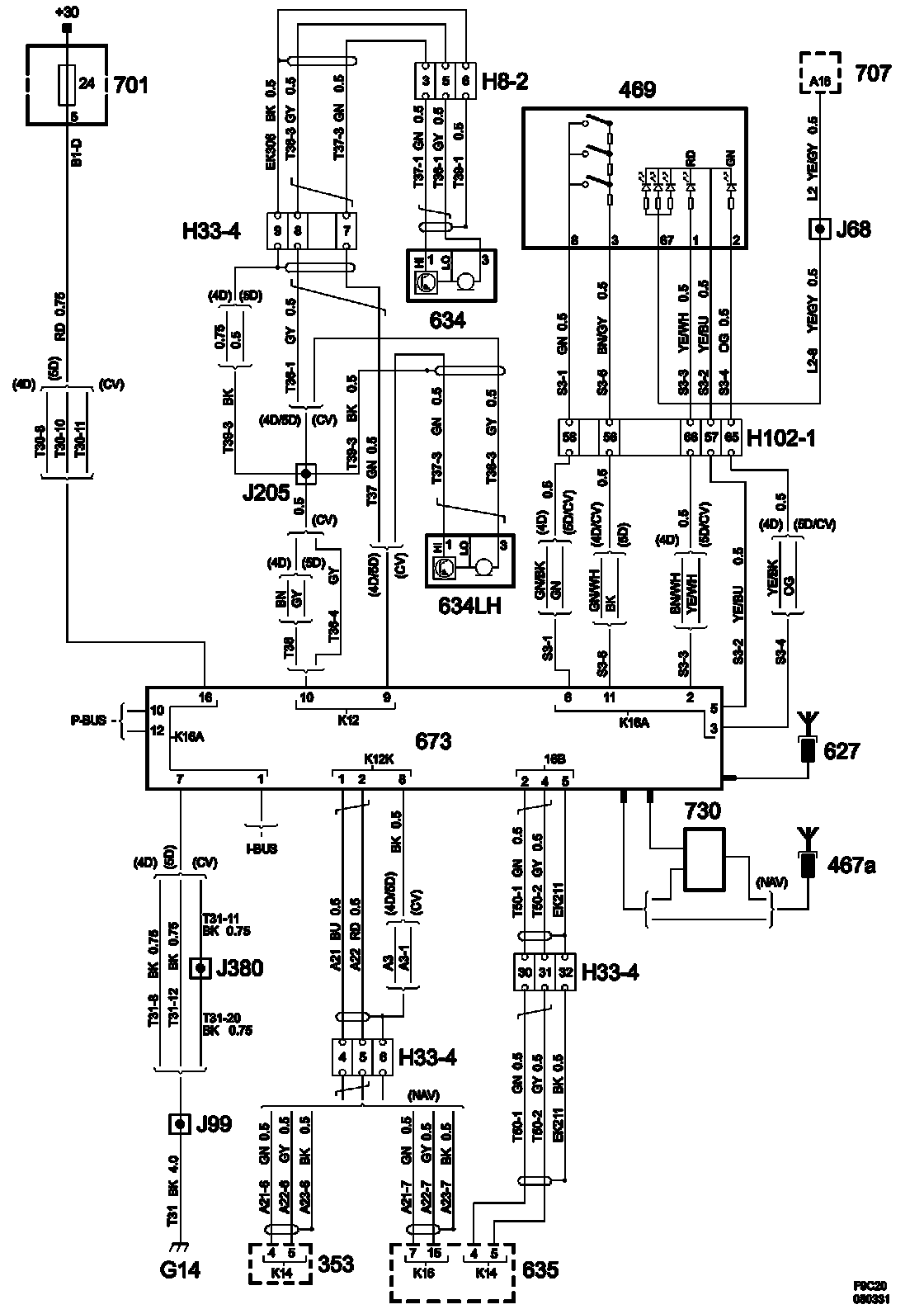 The diagrams for the power supplies that may be feeding this system (+30, +15, +54, +X, and +B) ) can be found at Power and Ground Distribution diagrams.