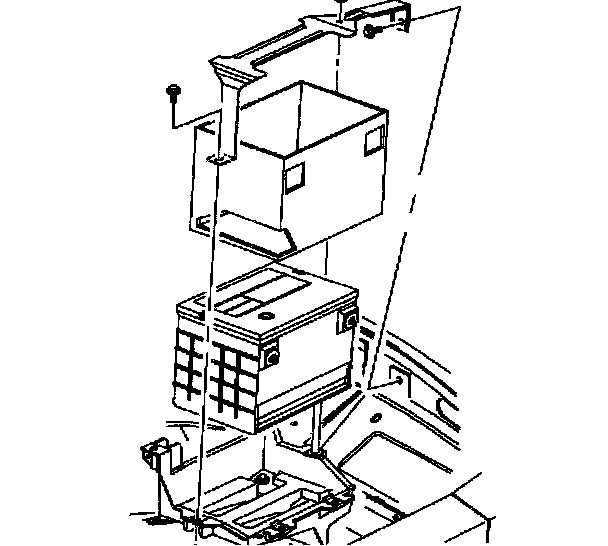 8. Install the battery hold-down retainer, locking the battery into the tray. Install and tighten the hold-down retainer nut and screw.