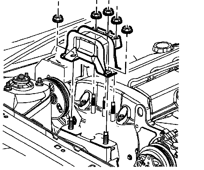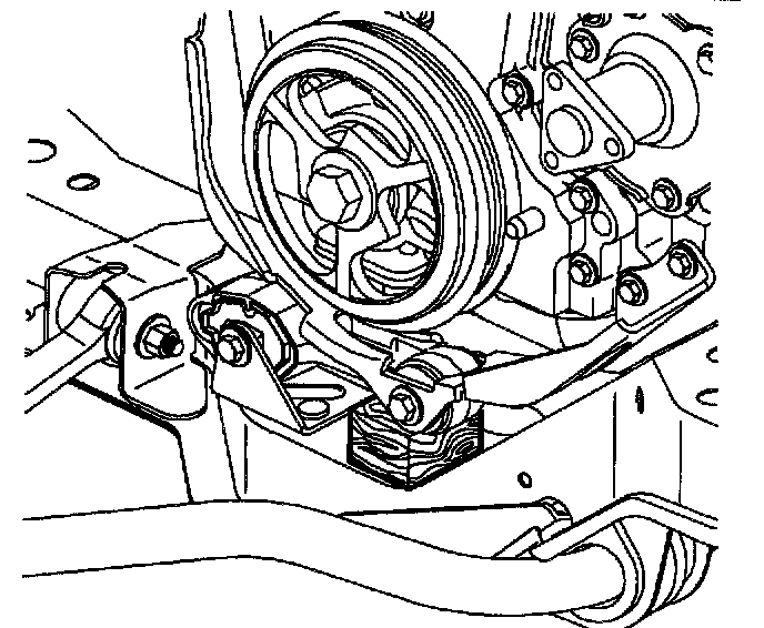 1. The right-hand upper engine mount and lower splash shield clips require removal for tensioner and idler pulley fastener access. A 1 inch x 1 inch x 2 inch long block of wood can be placed between the torque strut and cradle to support engine during mount removal.