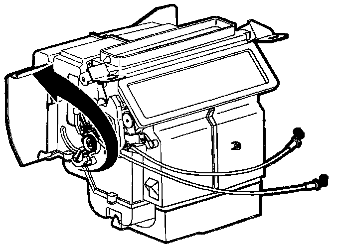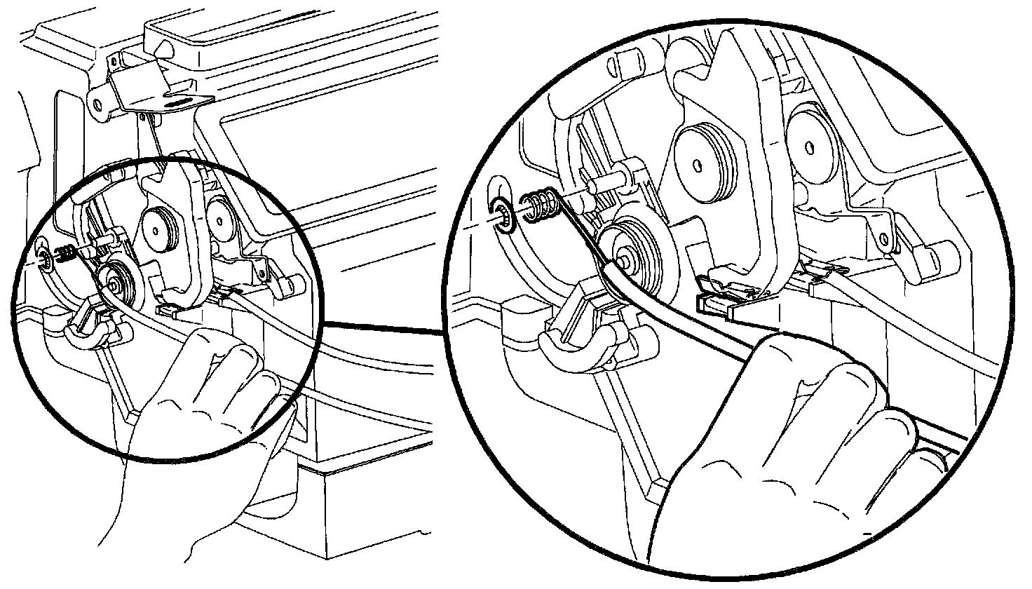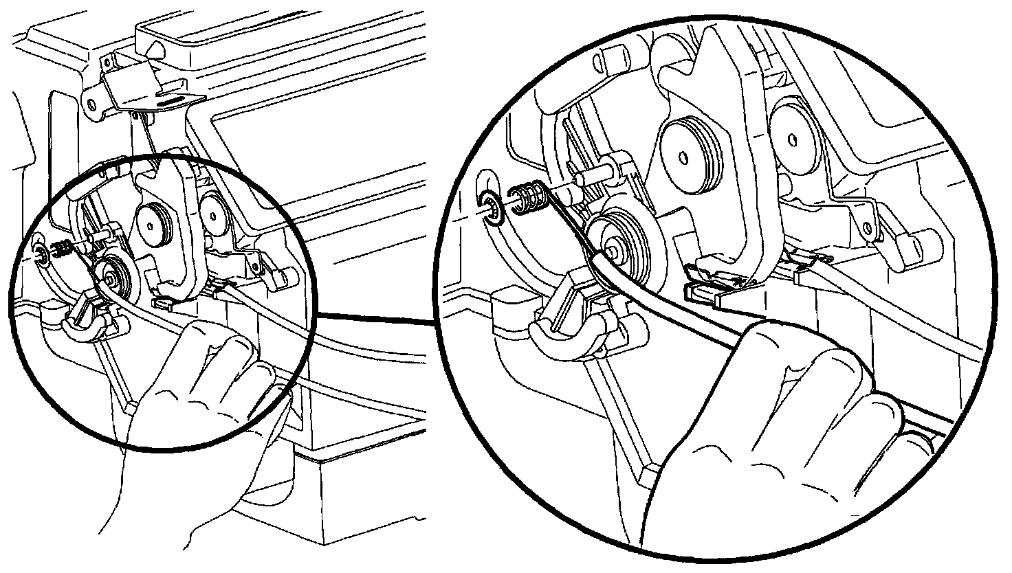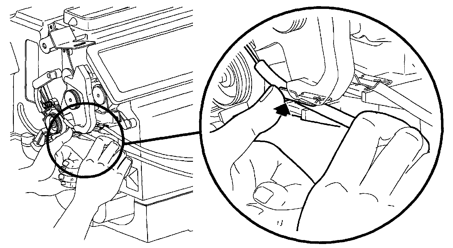 12. Remove temperature cable housing from retainer clip by pressing upward on upper tab of clip while gently pulling outward on cable housing.