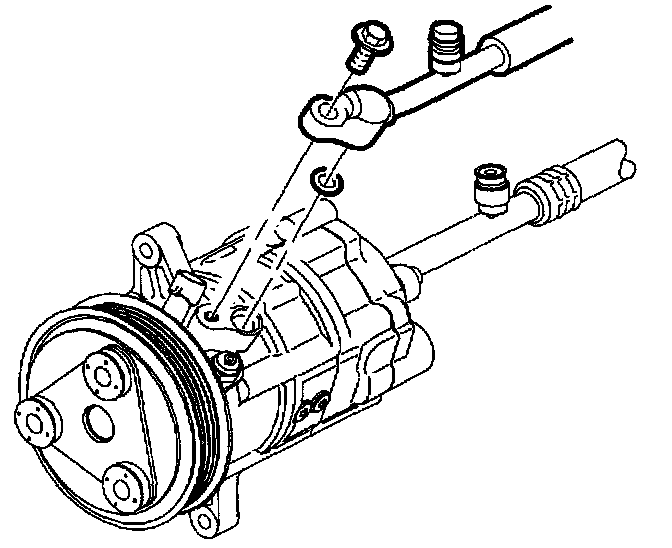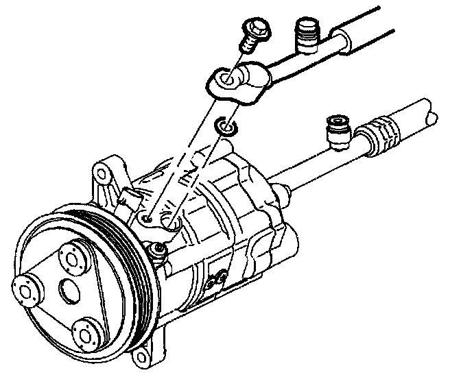 2. Lubricate and install new O-ring on discharge hose with R-12 Refrigerant oil (mineral). Install high side hose to compressor high side port. Torque to specification.
