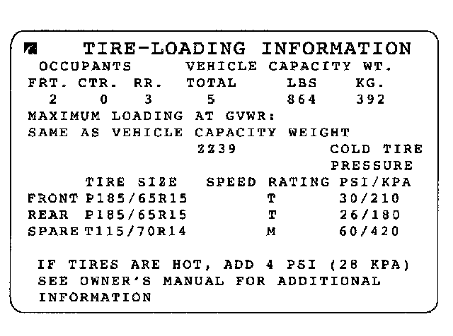 For tire pressure and maximum tire load rating specifications, refer to the tire loading information sticker located on the driver's door opening. below the door latch.