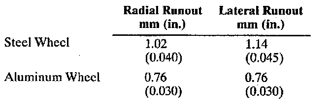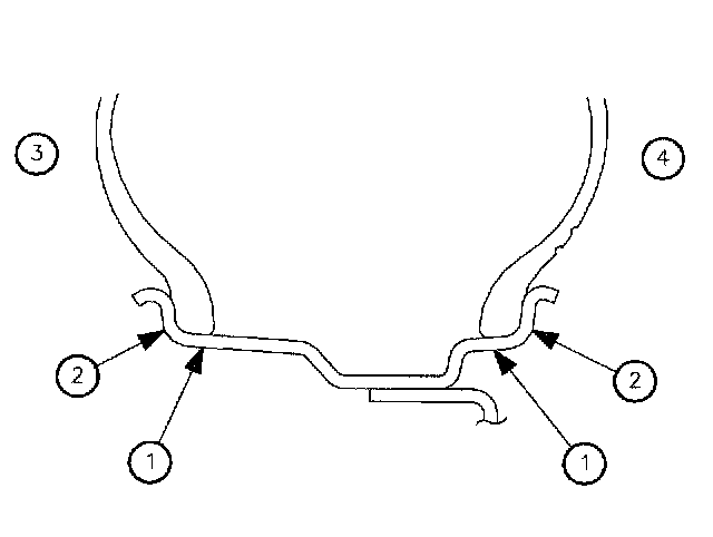 Wheel runout should be measured with an accurate dial indicator. Measurements may be taken with wheel installed on vehicle (be sure wheel bearings do not have excessive free play) or off vehicle on an accurate mounting fixture (such as a wheel balancing machine). Measure the (1) radial and (2) lateral runout of both (3) inboard and (4) outboard bead flanges.