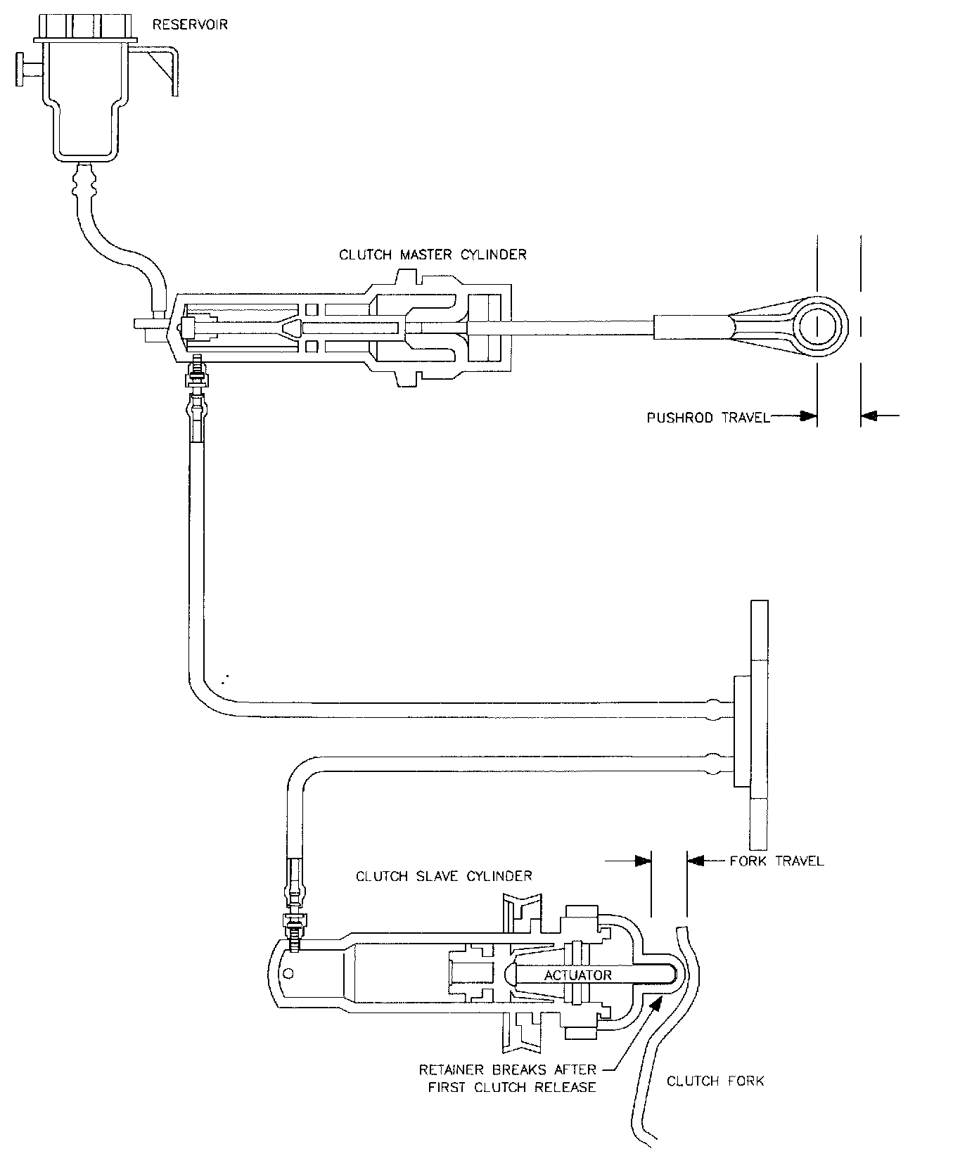 NOTICE: The clutch hydraulic system is serviced as a complete unit. It has been filled with fluid and bled of air. Individual components of the system are not available separately, except for the slave cylinder actuator pushrod plastic retainer strap and reservoir cap.
