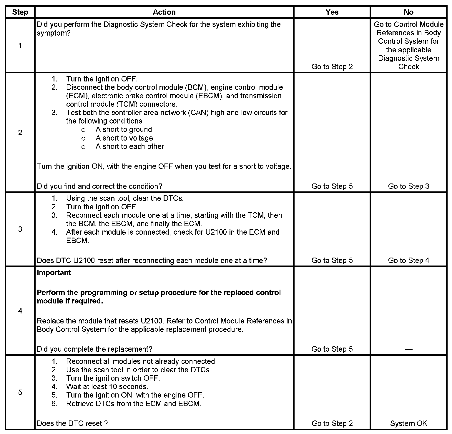 Modules connected to the CAN serial data circuit monitors communication during normal vehicle operation, where operation information is exchanged among the modules. Each module on the CAN network maintains a transmit error counter (TEC) and a receive error counter (REC). The counter values increase with detected errors and will decrease with error-free messages. If the TEC value exceeds 255, the controller removes itself from the network and DTC U2100 will result.