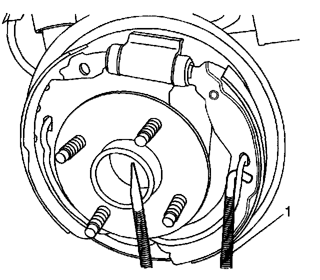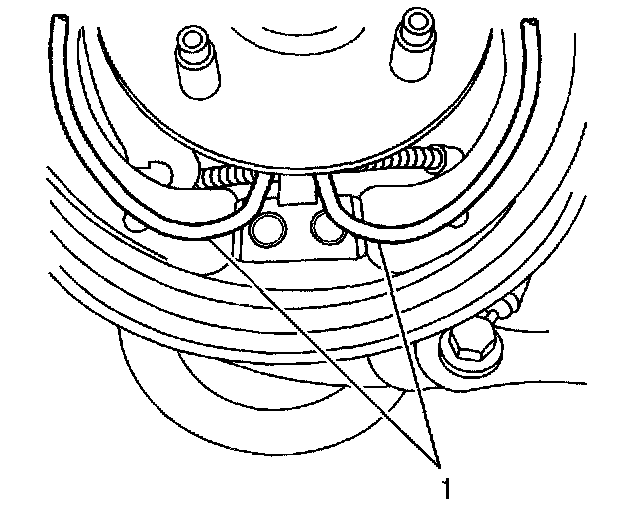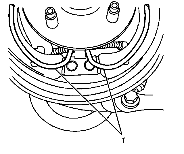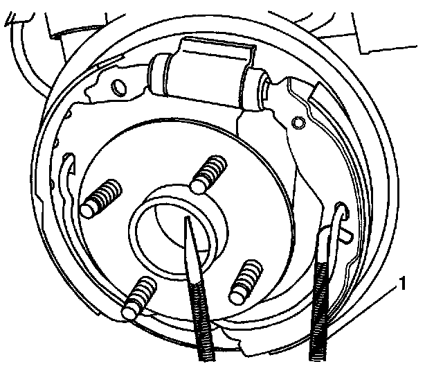 2. Position the hook end of the J 38400 (1) under the universal spring and lightly pull the universal spring end out, away from the hub, while installing the spring end into the shoe web hole.