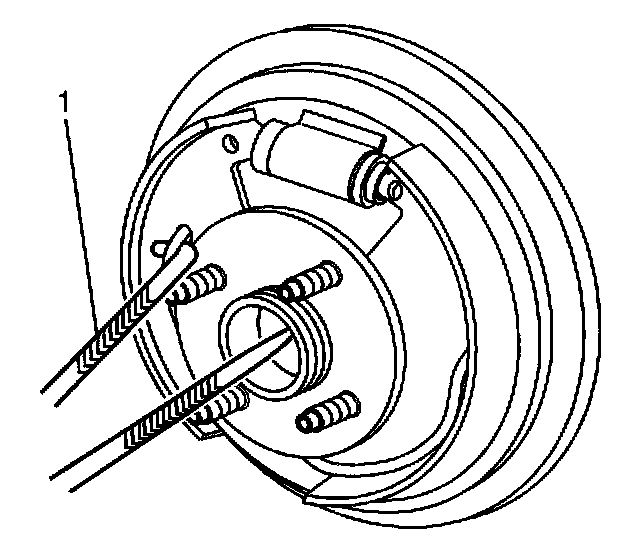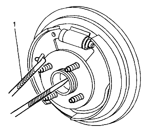 3. Position the hook end of the J 38400 (1) under the universal spring and lightly pull the universal spring end out, away from the hub, while installing the spring end into the shoe web hole.