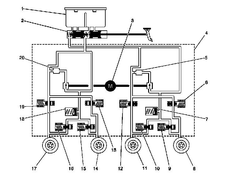 ^ Brake Pressure Modulator Valve (BPMV) - The BPMV contains the hydraulic valves and pump motor that are controlled electrically by the EBCM. The BPMV uses a 4 circuit configuration with a diagonal split. The BPMV directs fluid from the reservoir of the master cylinder to the left front and right rear wheels and fluid from the other reservoir to the right front and left rear wheels. The diagonal circuits are hydraulically isolated so that a leak or malfunction in one circuit will allow continued braking ability on the other.