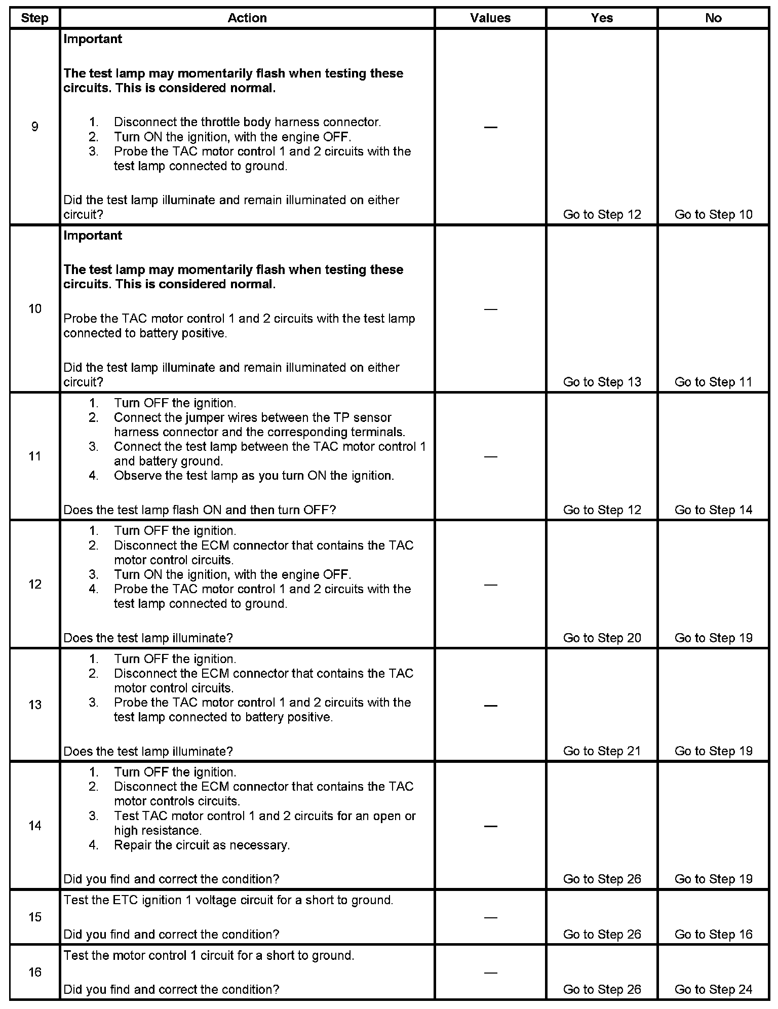 11. When the ignition is turned ON, the PCM operates the throttle control motor to verify the integrity of the system prior to start-up. This can be seen by the momentary flash of the test lamp as the ignition is turned ON.