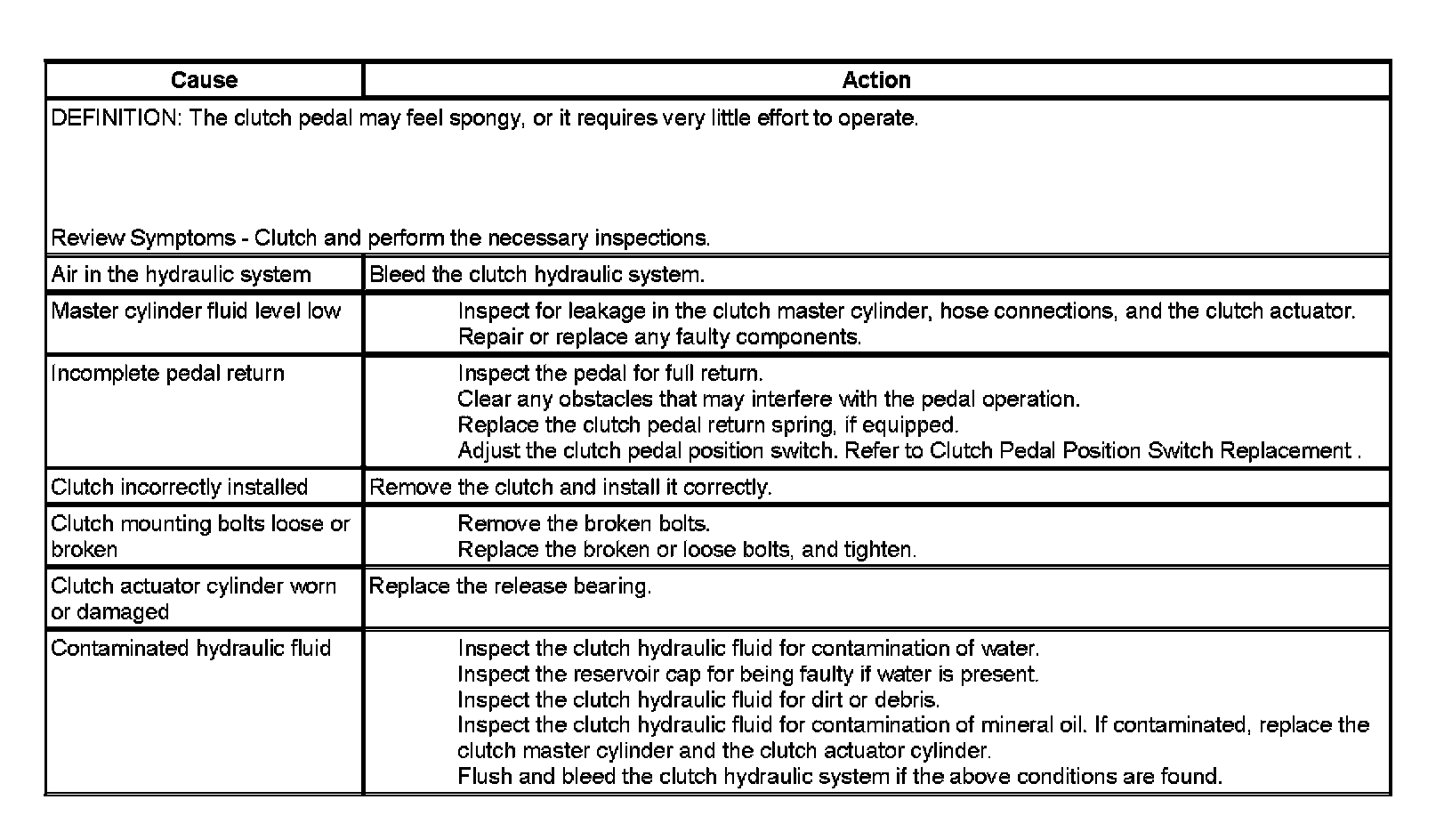 Clutch Pedal Spongy Low Pedal Effort: