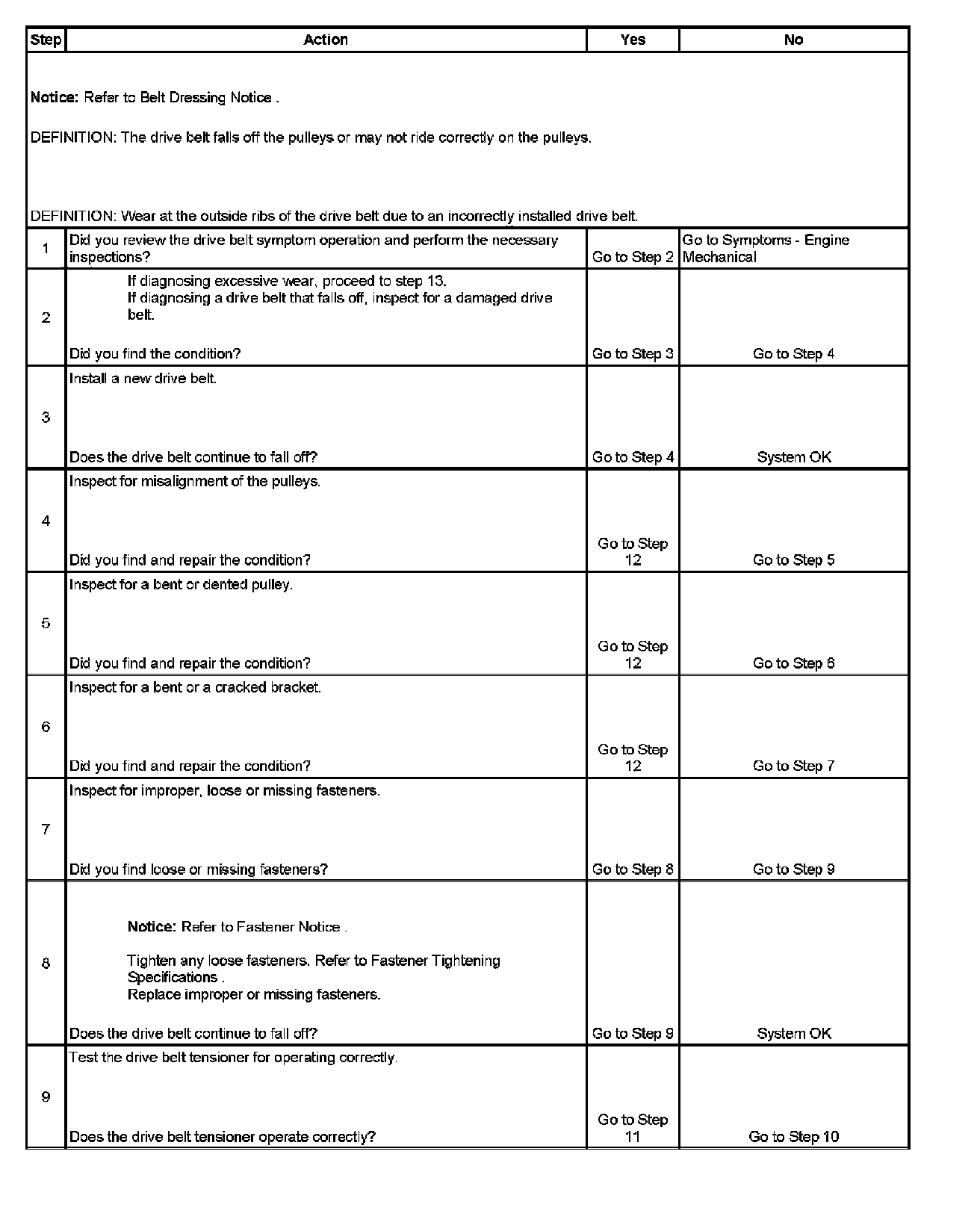 An extra load that is quickly applied on released by an accessory drive component may cause the drive belt to fall off the pulleys. Verify the accessory drive components operate properly.