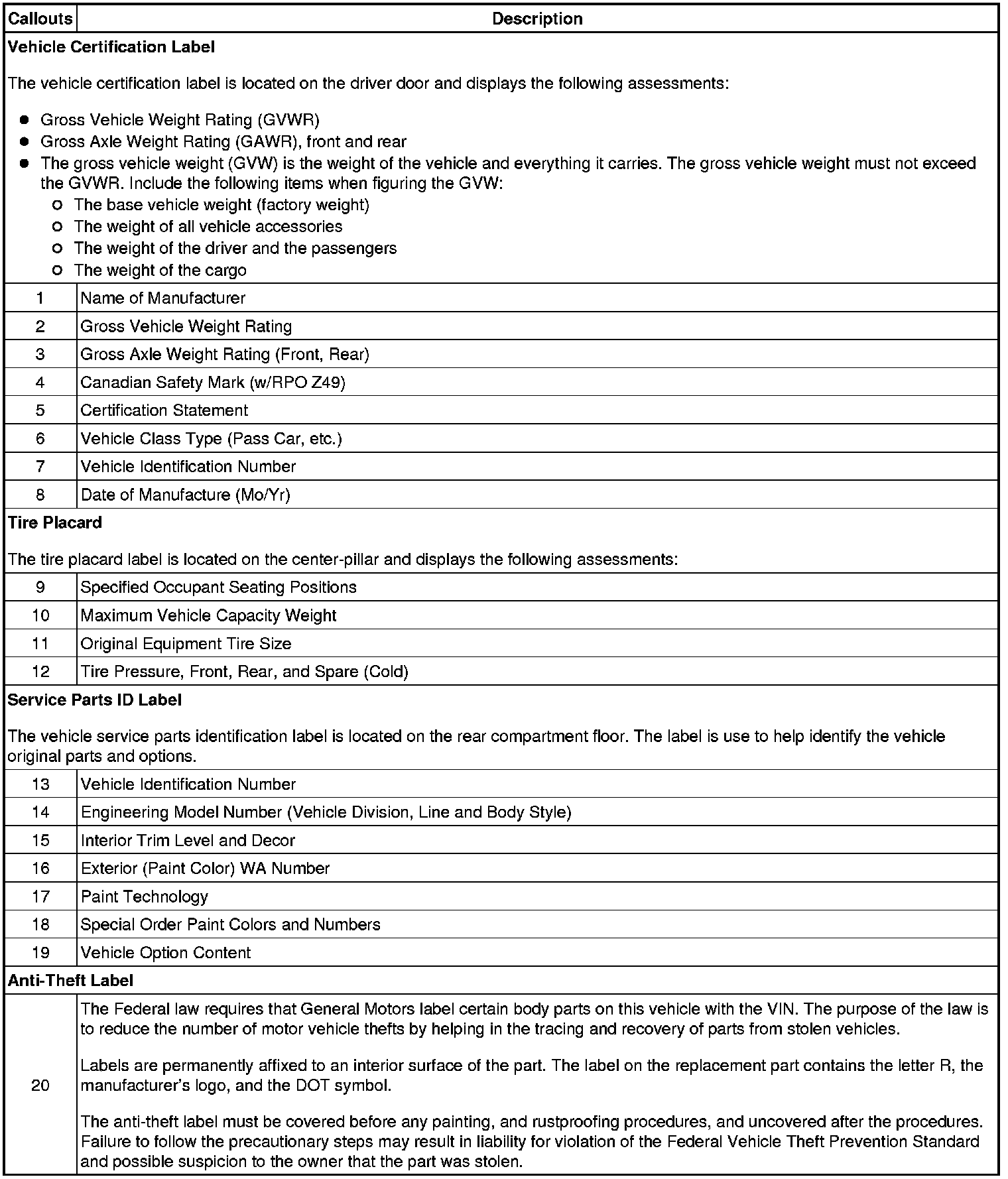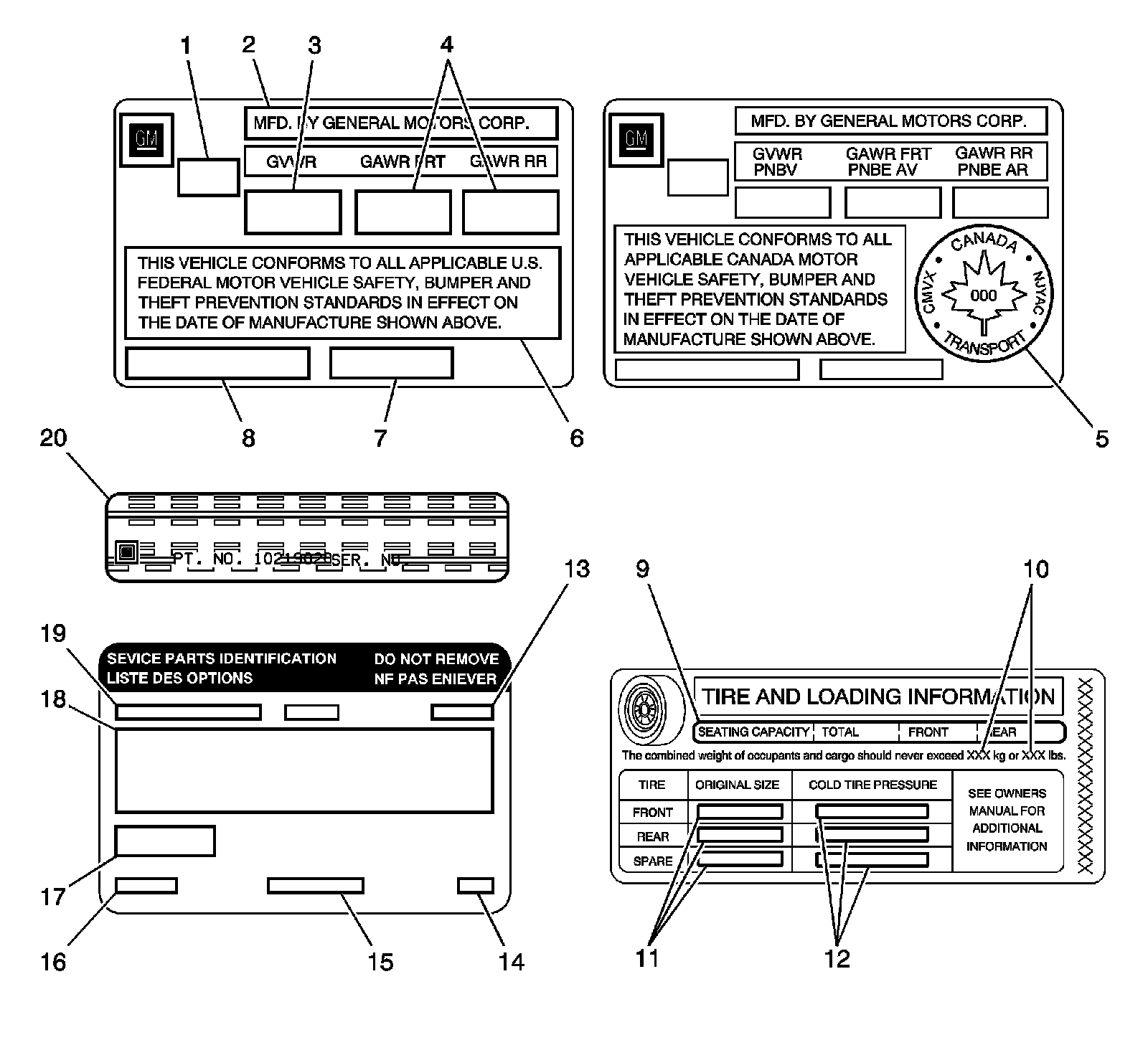 Vehicle Certification, Tire Placard, Anti-Theft, and Service Parts ID Label
