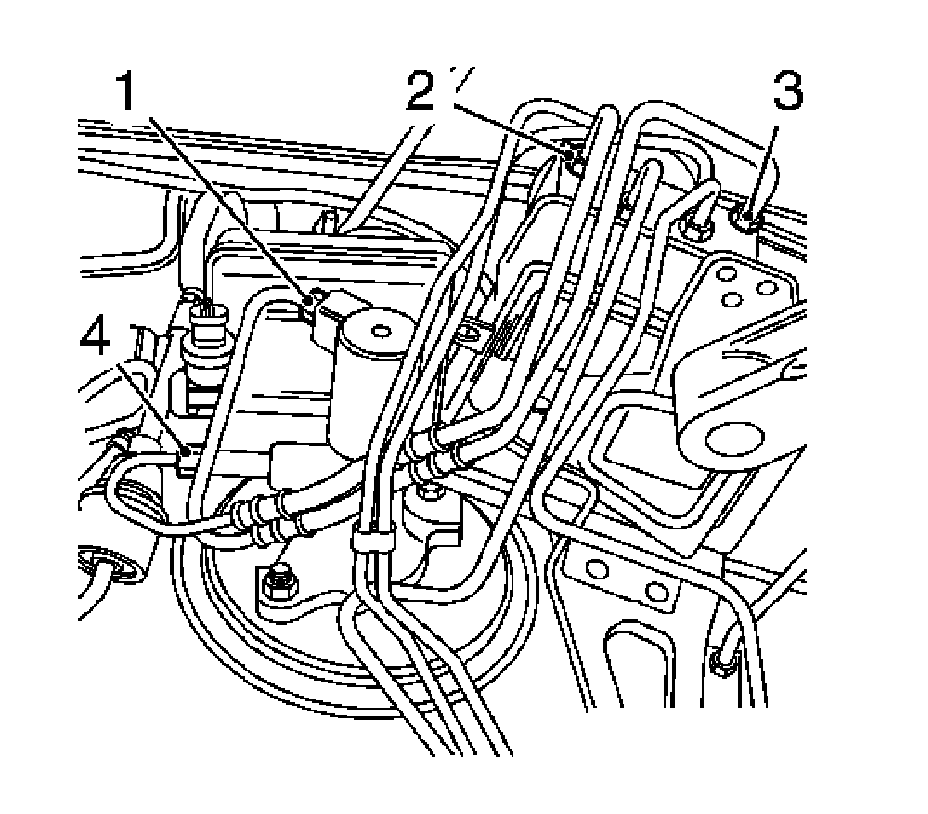 9. Disconnect the brake line for brake master cylinder circuit 2 from hydraulic modulator (3), then from the brake master cylinder (4).
