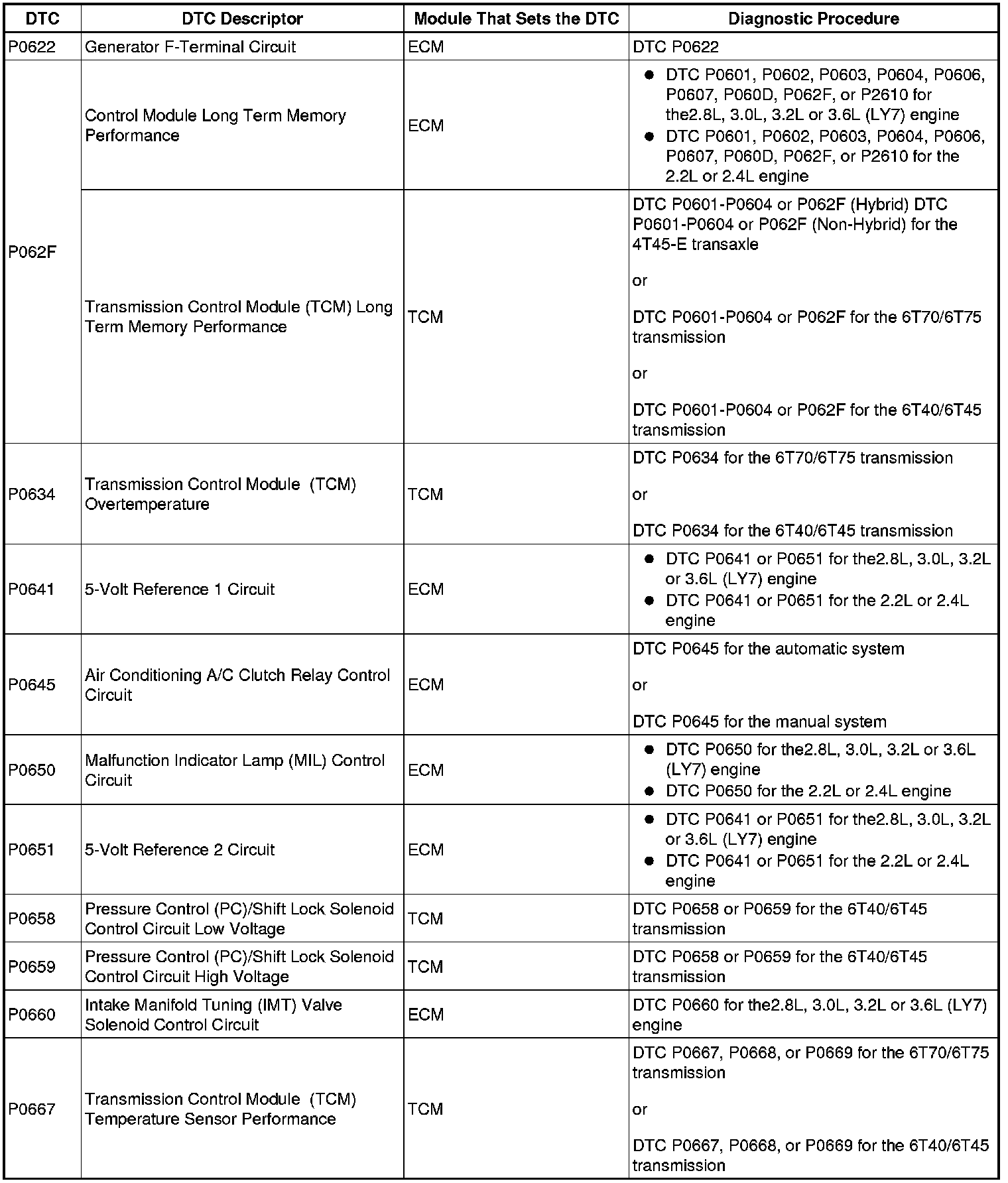 Diagnostic Trouble Code (DTC) List - VehicleThis master DTC list includes all applicable DTCs in alphanumeric order with descriptors.