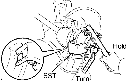b. Using a hammer handle or an equivalent to hold the axle hub sub-assembly LH, install the LH hub bolt by tightening the nut.
