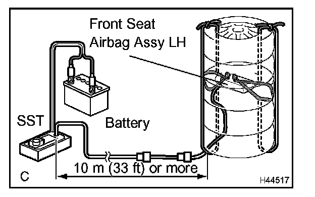 - When deploying the airbag, perform the operation at least 10 m (33 ft) away from the front seat airbag assembly LH.