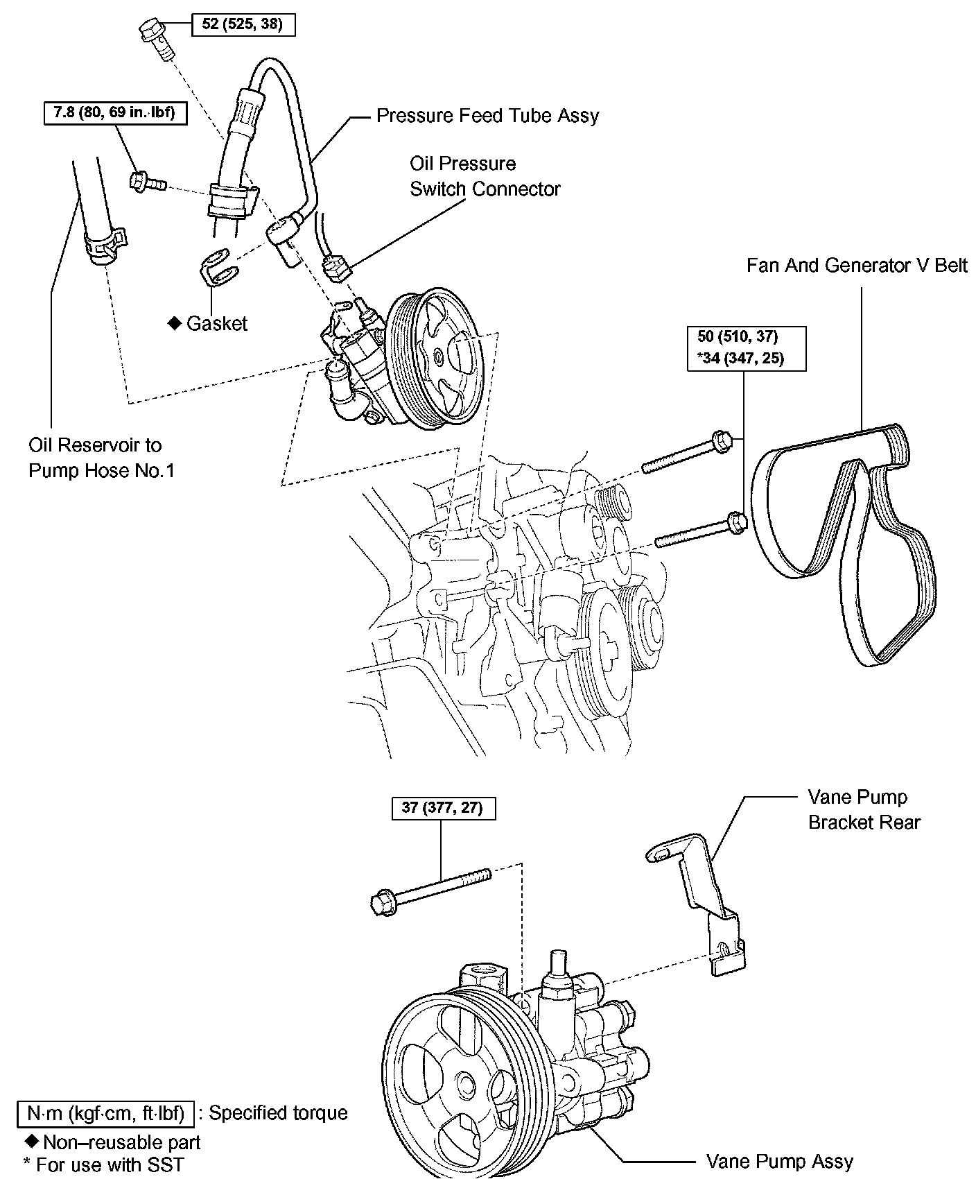 a. Install the pressure feed tube assembly and a new gasket to the vane pump assembly with the union bolt.