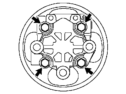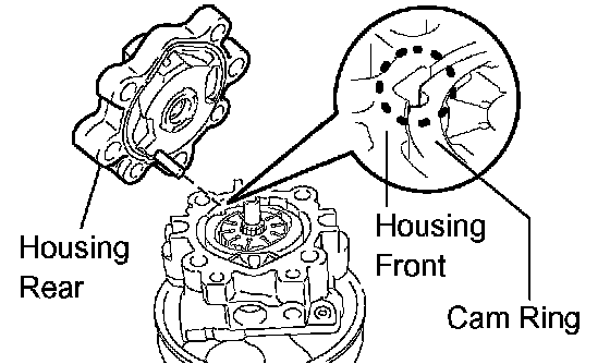 b. Align the straight pin of the housing rear with the dents of the cam ring, side plate front and the housing front, and install the housing rear with the 4 bolts.