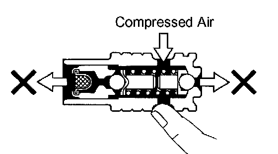 b. Check the flow control valve for leakage. Close one of the holes and apply compressed air, 392 to 490 kPa (4 to 5 kgf/cm2, 57 to 71 psi), into the opposite side hole, and confirm that air does not come out from the end holes.