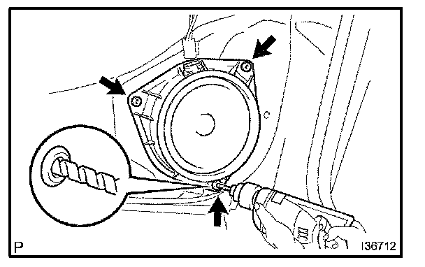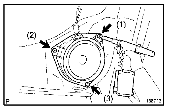 b. Using a drill of less than dia 4 mm (0.16 in.), drill out the 3 rivet heads and remove the front No.1 speaker assembly from the front door panel.