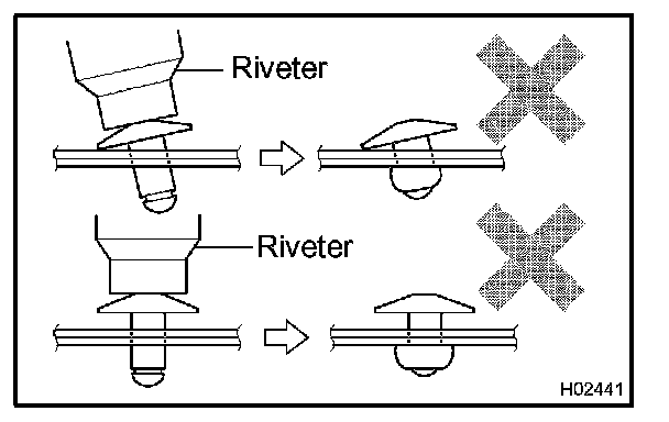 - Do not tilt the riveter or disconnect the rivet from the materials because until the materials are securely tightened, misalignment may occur.