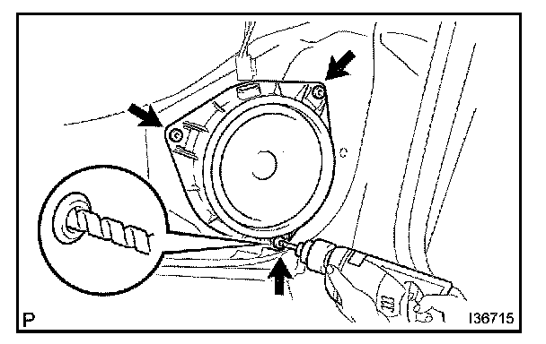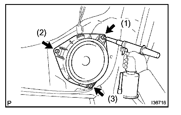 b. Using a drill of less than dia 4 mm (0.16 in.), drill out the 3 rivet heads and remove the rear speaker assembly from the rear door panel.