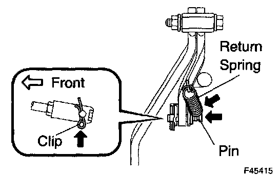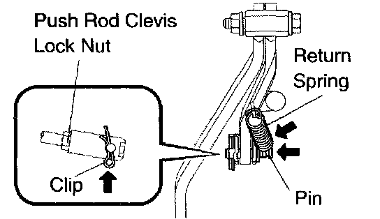 b. Remove the brake pedal return spring, the clip and the clevis pin.
