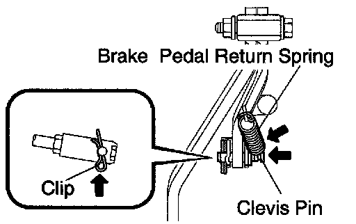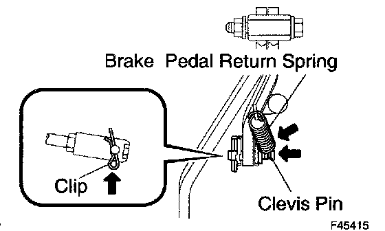 c. Remove the clip and the clevis pin and separate the master cylinder push rod clevis from the brake pedal sub-assembly.