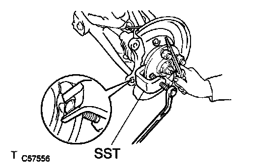 a. Using SST and a screwdriver or an equivalent to hold the axle hub sub-assembly LH, remove the LH hub bolt.