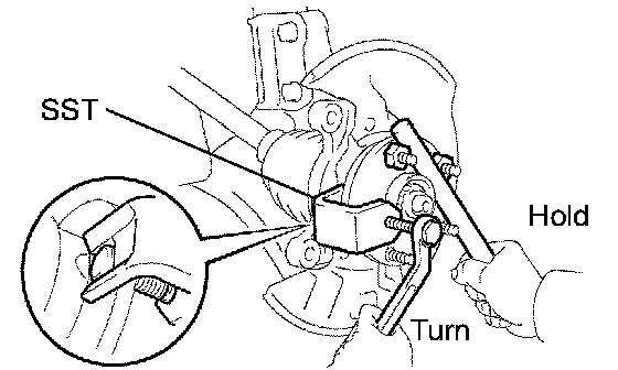 b. Using SST and a hammer handle or an equivalent to hold the axle hub LH, remove the LH hub bolt.