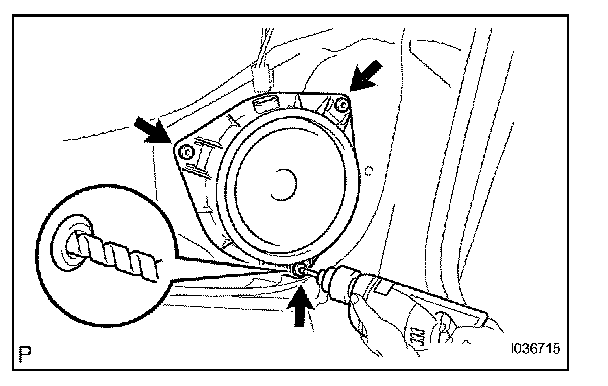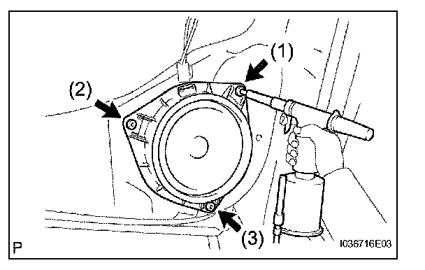 b. Using a drill of less than Dia 4 mm (0.16 in.), drill out the 3 rivet heads and remove the rear speaker assembly from the rear door panel.