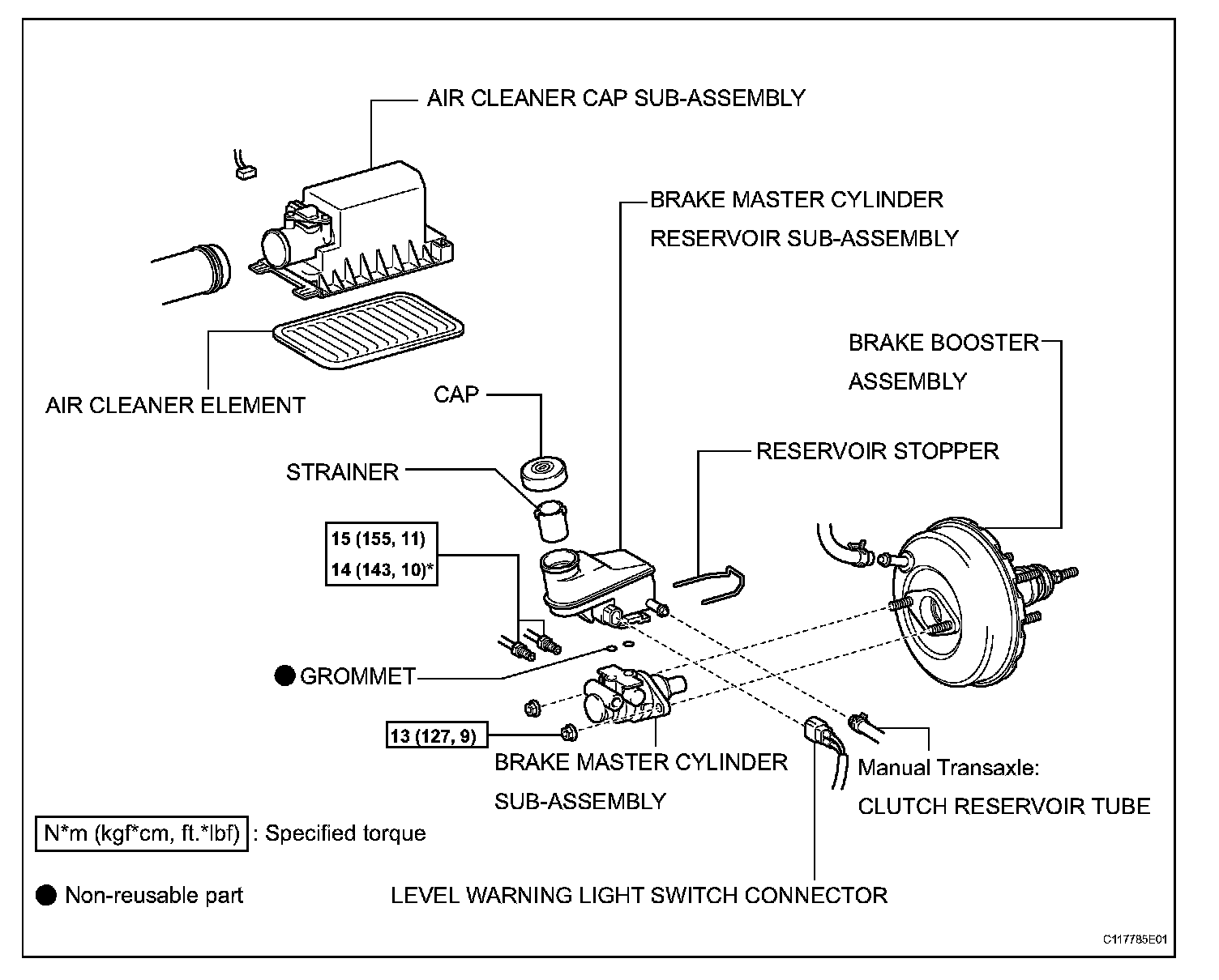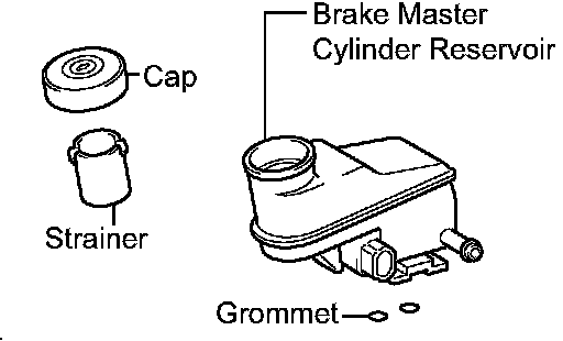 b) Remove the brake master cylinder reservoir and 2 grommets from the brake master cylinder.