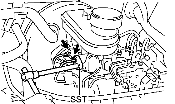 b) Using SST, disconnect the 2 brake lines from the brake master cylinder.