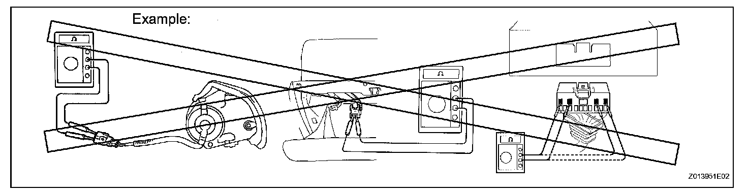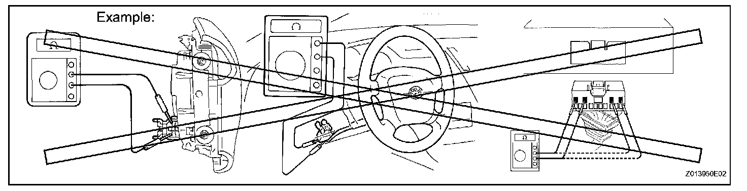 2. Never measure the resistance of the airbag squib. This may cause the airbag to inflate, which could cause a serious injury.