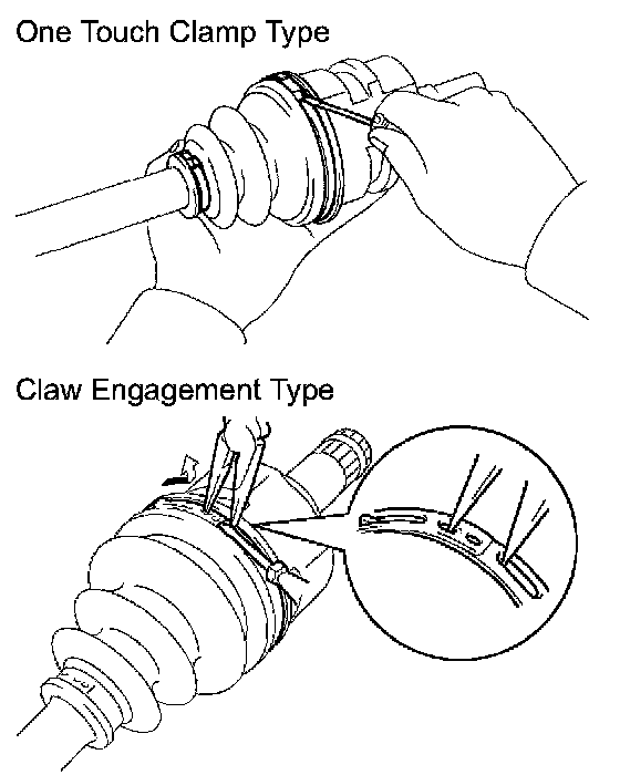 b. Claw engagement type: Using needle nose pliers, remove the inboard joint boot clamp as shown in the illustration.