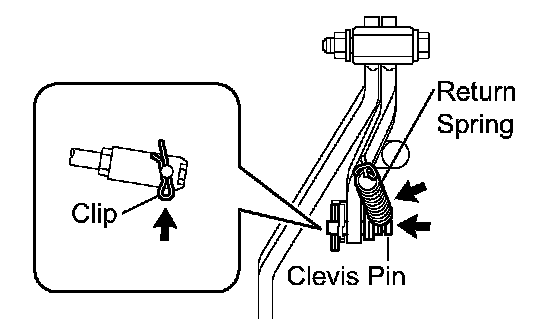 b) Remove the brake pedal return spring, clip and clevis pin.