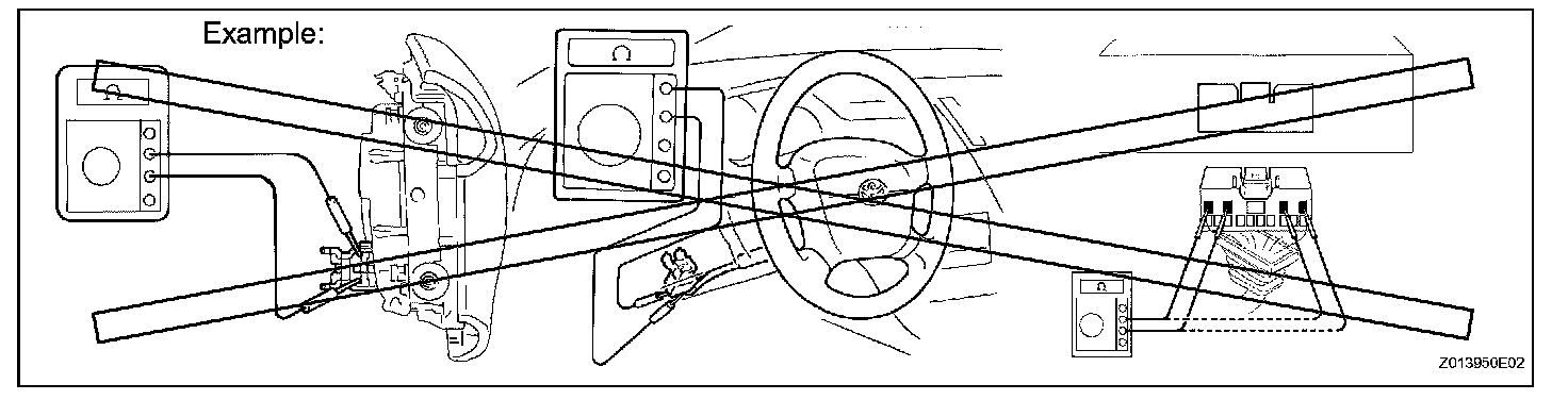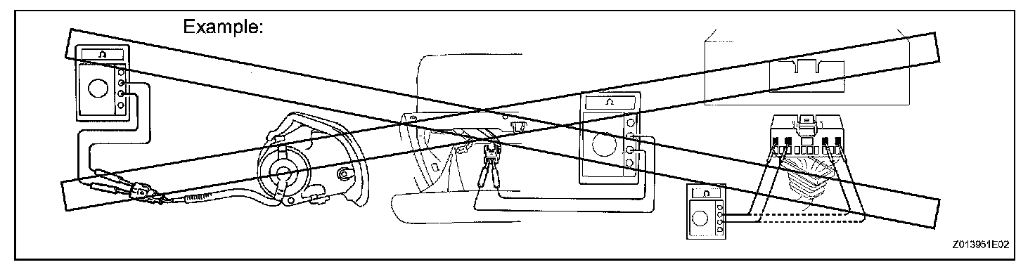 2. Never measure the resistance of the airbag squib. This may cause the airbag to inflate, which could cause serious injury.